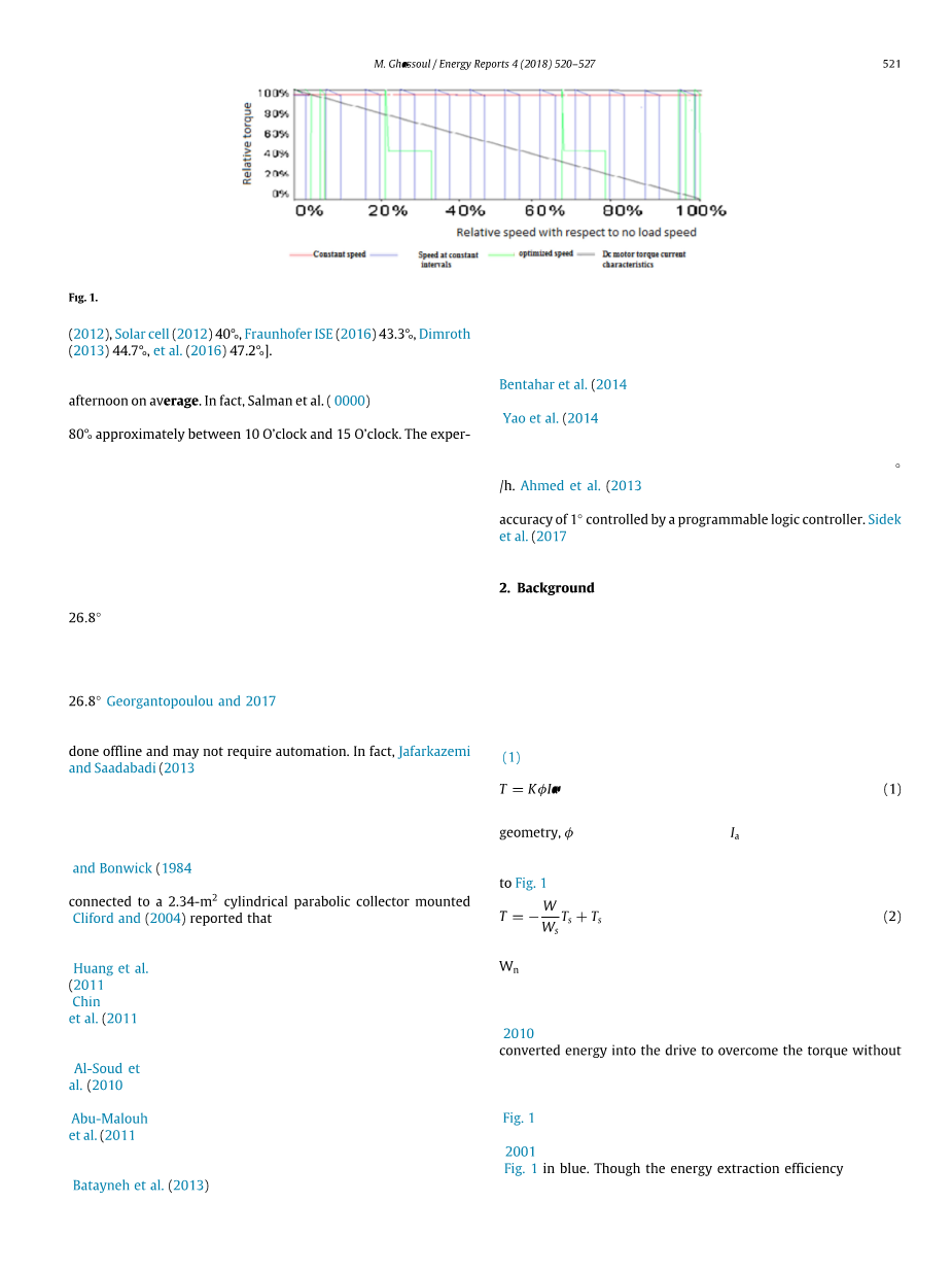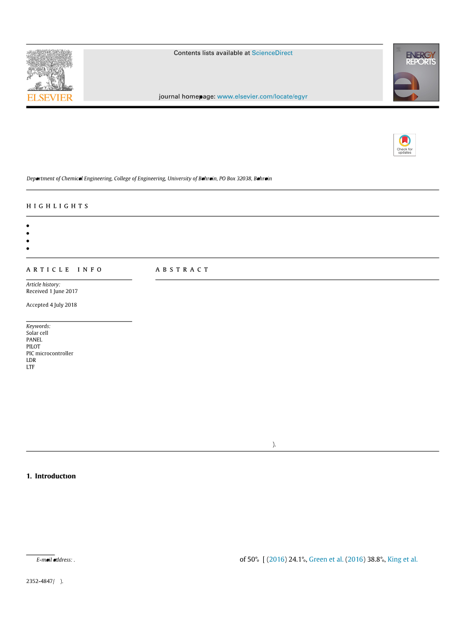 如果太阳能电池板固定在东西方向的中间,提取时间平均大约在下午10点到15点之间。事实上,萨尔曼等人(Sections-Clouds,0000)已经表明,太阳辐射在巴林,大约在10点和15点之间达到80%以上。实验于6月26日仲夏进行。因此,提取的能量非常有限。如果再加上清洁成本,尤其是在像我们这样的多尘地区,要与化石燃料生产的传统能源竞争是相当困难的。要使太阳能具有竞争力,至少需要解决两个问题。一个是在电池方面,科学家必须提出高效率的电池,另一个是在工程方面,工程师必须找到电池的最佳位置。在过去,人们使用太阳能与固定面板之间的地理位置的东西大约26.8°向南方倾斜的角度(在巴林)。研究表明这不是最大化能量提取的理想位置。一个更好的方法是使用单轴或双轴将面板连续朝向太阳。选择单轴的原因如下。正如前面提到的,倾斜角大约是26.8(Georgantopoulou和Vasilikos,2017年)。这意味着,它离赤道不远。这意味着倾角每年只需要调整两到三次。这可以离线完成,可能不需要自动化。事实上,Jafarkazemi和Saadabadi (2013年)建议,在阿布扎比,倾斜角至少每年改变两次,阿布扎比的倾斜角与巴林几乎相同。确定倾斜角度需要另一个需要额外能耗的电机,但这并不重要,因为倾斜角度一年最多可以调整四次。许多研究人员已经发表了他们在这方面的工作。Hession和Bonwick (1984)设计了一种太阳跟踪器,利用连接到安装在一个简单结构上的2.34柱面抛物面收集器的光电晶体管来检测太阳位置。