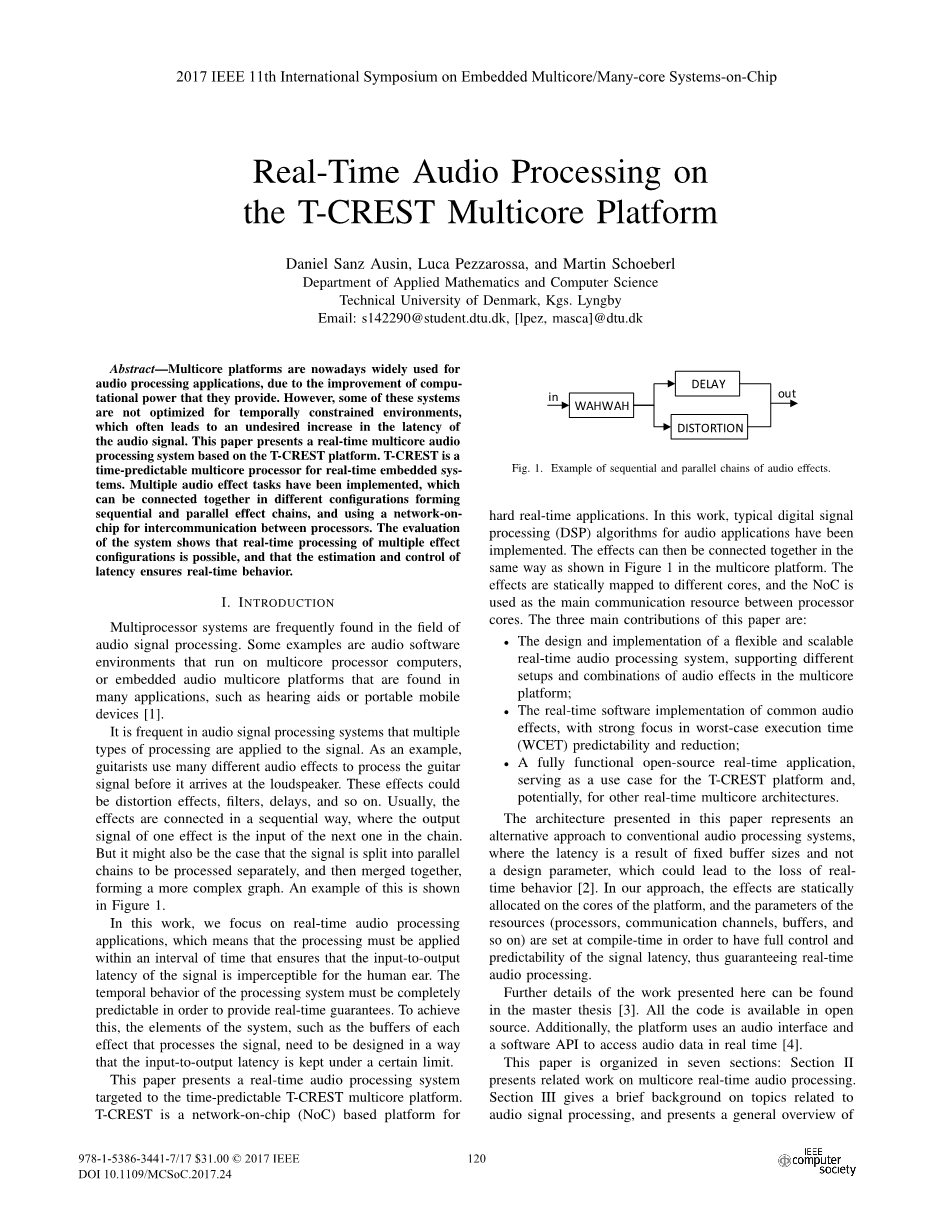 摘要—由于多核平台提供的计算能力的提高,多核平台现在广泛用于音频处理应用。然而,这些系统没有针对时间受限的环境进行优化,这经常导致音频信号延迟增加。本文提出了一种基于T-CREST平台的实时多核音频处理系统。T-CREST是一款用于实时嵌入式系统的时间可预测多核处理器。已经实现了多个音频效果任务,这些任务可以以不同的配置连接在一起,形成顺序和并行效果链,并且使用片上网络在处理器之间进行相互通信。对系统的评估表明,多效果配置的实时处理是可能的,并且延迟的估计和控制确保了实时行为。