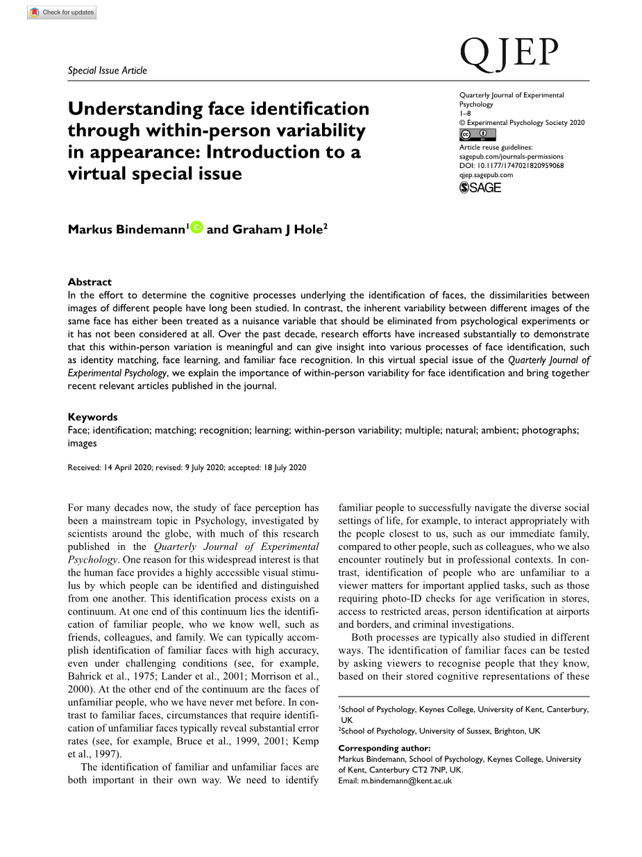 For many decades now, the study of face perception has been a mainstream topic in Psychology, investigated by scientists around the globe, with much of this research published in the Quarterly Journal of Experimental Psychology. One reason for this widespread interest is that the human face provides a highly accessible visual stimulus by which people can be identified and distinguished from one another. This identification process exists on a continuum. At one end of this continuum lies the identification of familiar people, who we know well, such as friends, colleagues, and family. We can typically accomplish identification of familiar faces with high accuracy, even under challenging conditions (see, for example, Bahrick et al., 1975; Lander et al., 2001; Morrison et al., 2000). At the other end of the continuum are the faces of unfamiliar people, who we have never met before. In contrast to familiar faces, circumstances that require identification of unfamiliar faces typically reveal substantial error rates (see, for example, Bruce et al., 1999, 2001; Kemp et al., 1997).