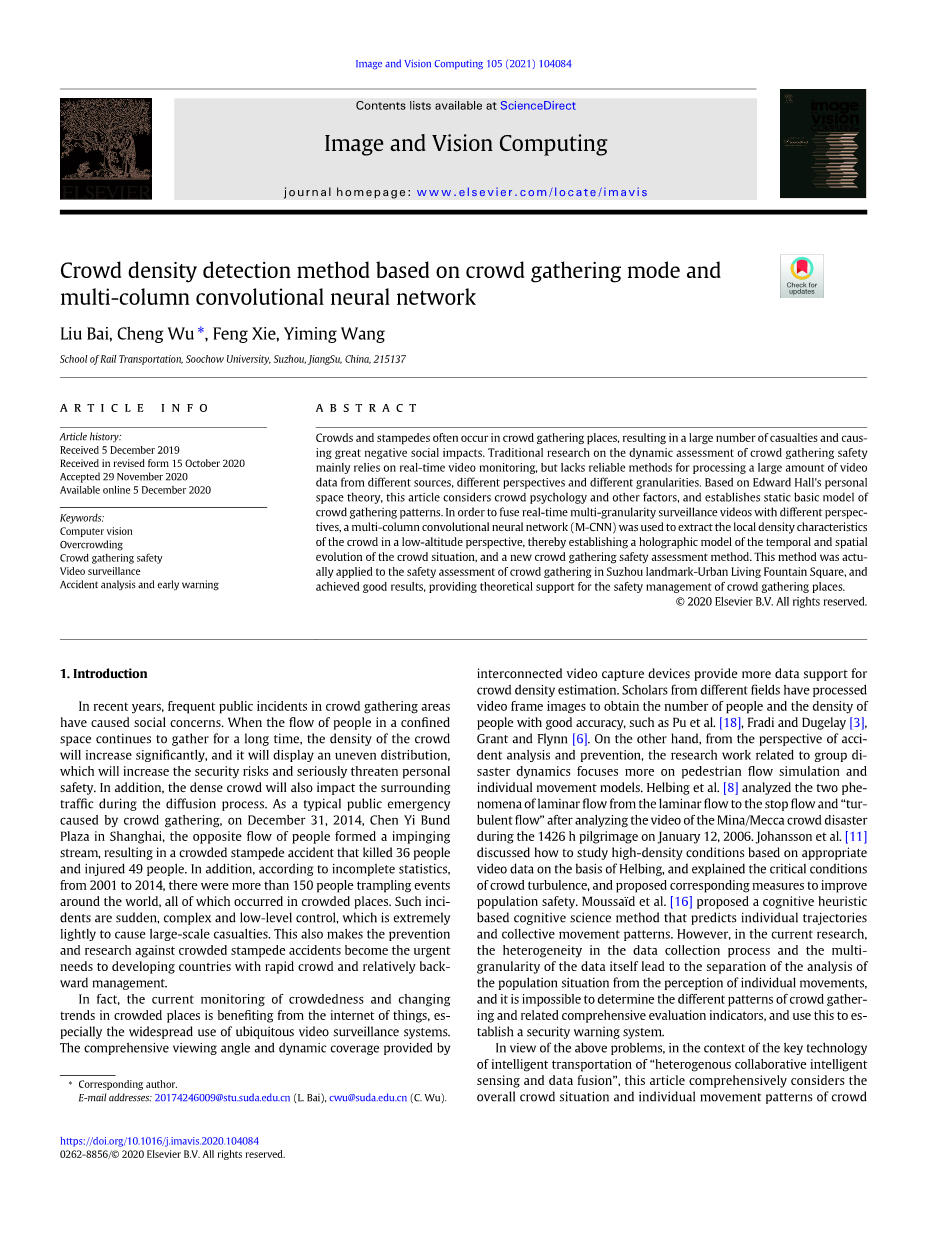 事实上,目前对拥挤场所的拥挤度和变化趋势的监控得益于物联网,特别是无处不在的视频监控系统的广泛使用。互联视频采集设备提供的综合视角和动态覆盖为人群密度估计提供了更多的数据支持。来自不同领域的学者已经对视频图像帧进行了处理,以获得准确的人数和人口密度,如Pu等人, Fradi 和 Dugelay , Grant 和 Flynn。另一方面,从事故分析和预防的角度出发,群体动力相关的研究工作更多地集中在行人流动模拟和个体运动模型上。Helbing等人在分析了2006年1月12日1426小时的朝圣期间的米纳/麦加人群拥堵灾难的视频后,分析了层流从层流到停止流和“紊流”两种现象。。Johansson等人讨论了如何在Helbing的基础上,基于适当的视频数据研究高密度条件,并解释了人群紊流的临界条件,提出了相应的改善人口安全的措施。Moussaiuml;d 等人提出了一种基于认知启发式的认知科学方法,可以预测个体的轨迹和集体的运动模式。然而,在目前的研究中,数据收集过程的异质性和数据本身的多粒度导致了对人口状况的分析与对个体运动的感知分离,无法确定不同的人群聚集模式及相关的综合评价指标,并以此建立安全预警系统。