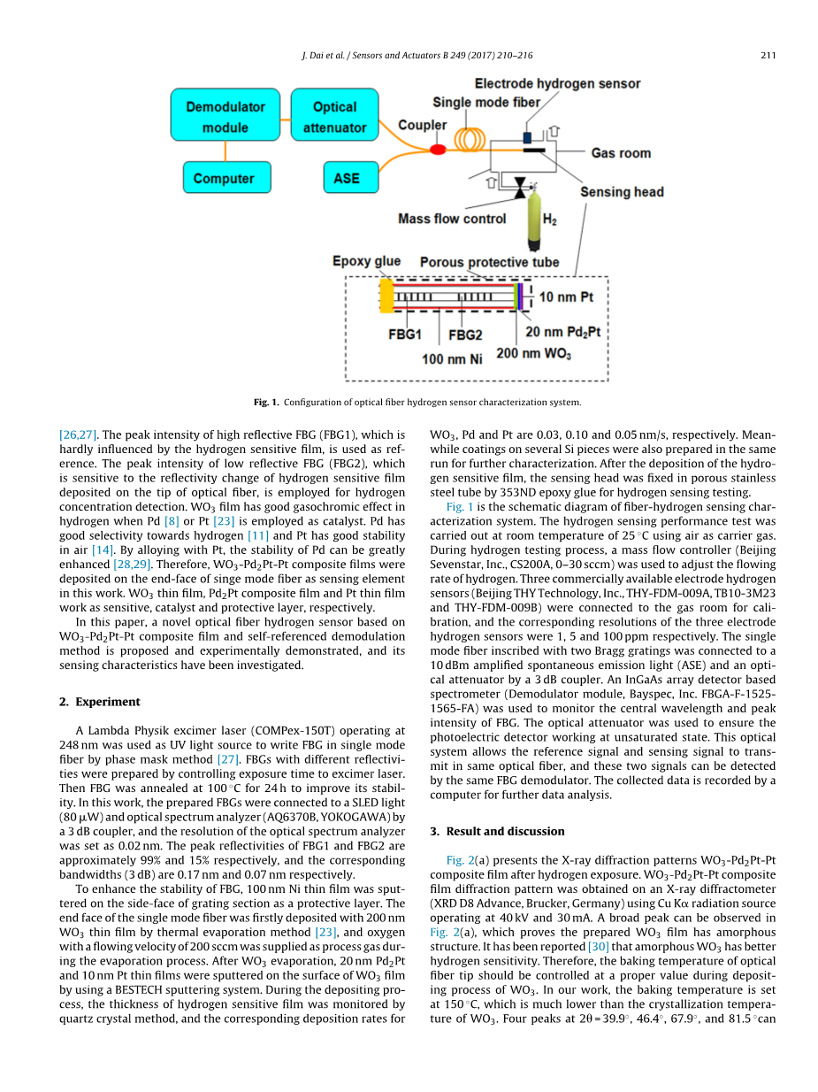 为了提升FBG的稳定性,将100nm的Ni薄膜溅射到光栅断面侧面作为保护层。首先用热蒸汽法在单模光纤的端面镀上WO3薄膜,在蒸发过程中供应流速为200sccm的氧气作为生产气体。在WO3蒸发后20nm的Pd2Pt和10nm的Pt薄膜通过使用BESTECH溅射系统溅射到WO3镀膜表面。在这堆积的过程中,氢敏薄膜的厚度用石英晶体法来监控,WO3、Pd和Pt的相应沉积速率分别为0.03,0.10and0.05nm/s。同时,在相同的运行过程中还制备了几个Si片上的涂层以进行进一步表征。在氢敏感膜沉积后,传感探头用第353ND氧树脂胶固定在多孔不锈钢管内进行氢敏检测。