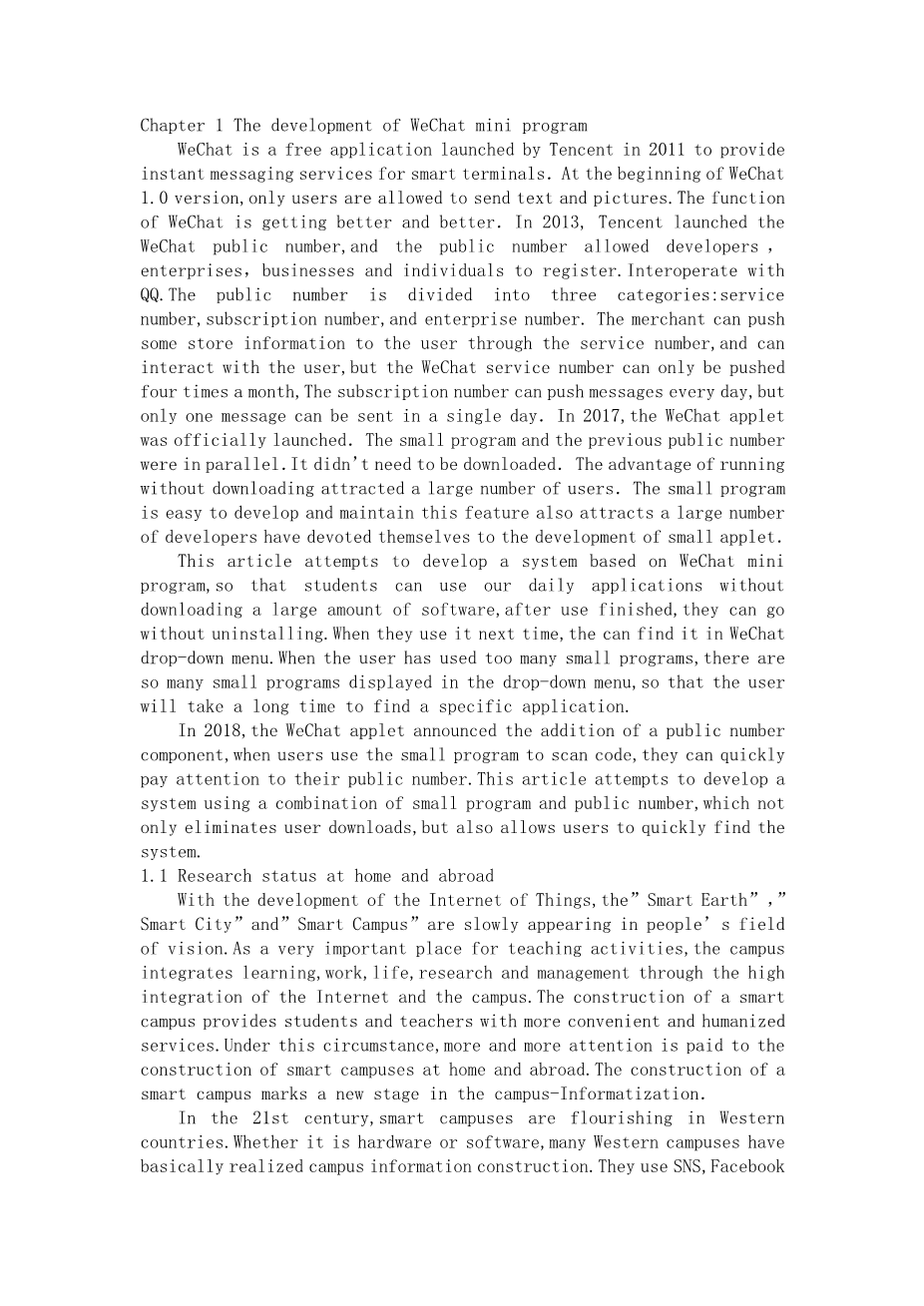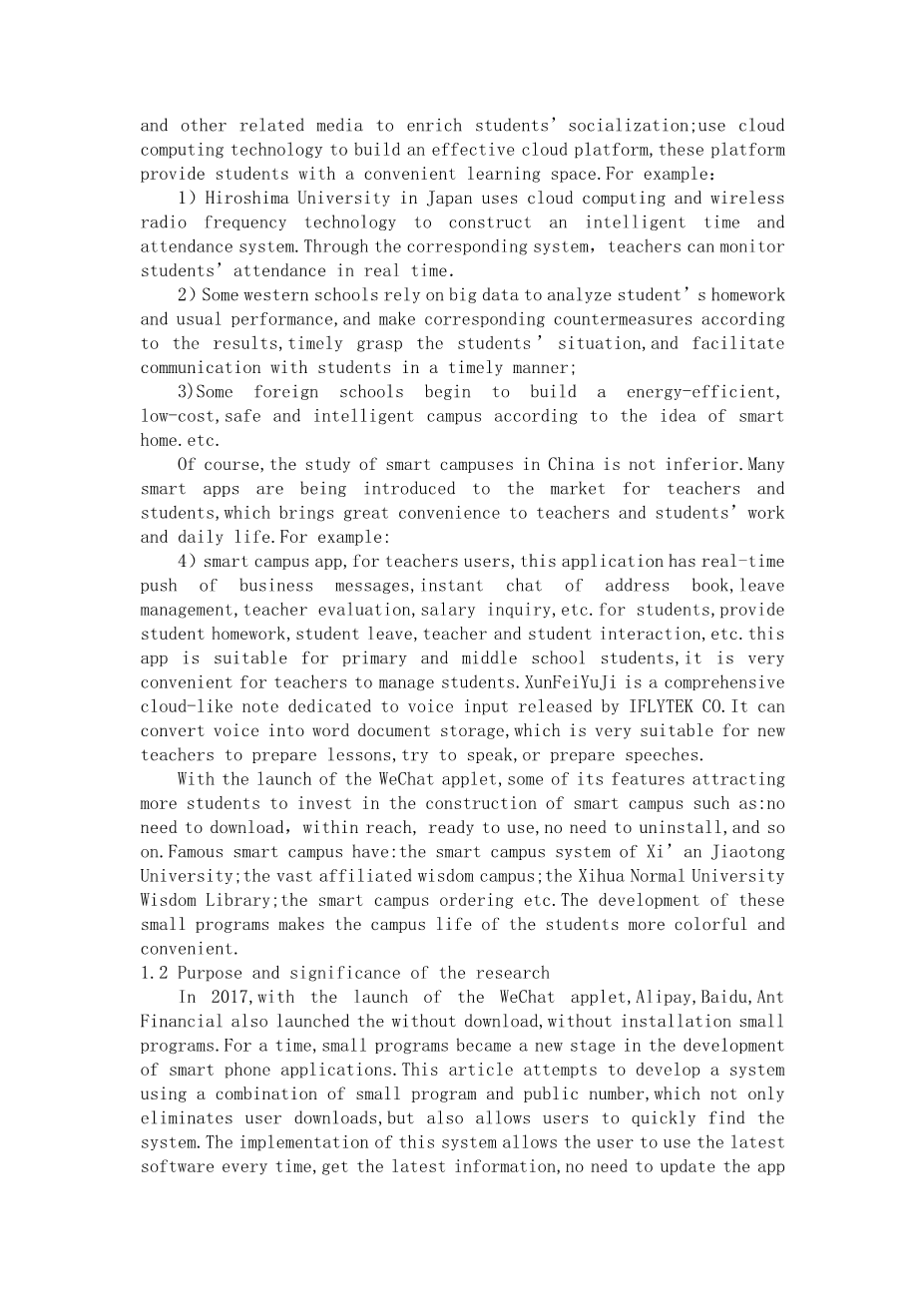 2017年,随着微信、支付宝、百度小程序的推出,蚂蚁金服也推出了无需下载、无需安装的小程序。一段时间以来,小程序成为智能手机应用程序开发的一个新阶段。本文尝试使用小程序和公共号的组合来开发一个系统,这样不仅可以使用户免于下载,还可以使用户快速找到系统。本系统的实现允许用户每次使用最新的软件,获取最新的信息,不需要每次更新之前的app。该系统的开发与学生的日常学习和生活密切相关,可以为学生的学习和生活带来了极大的方便,具有良好的应用价值和研究意义。市场上有很多专门为智慧校园设计的应用,比如智能校园订餐系统、智能校园考勤系统等。与这些系统相比,本系统具有以下优点:
