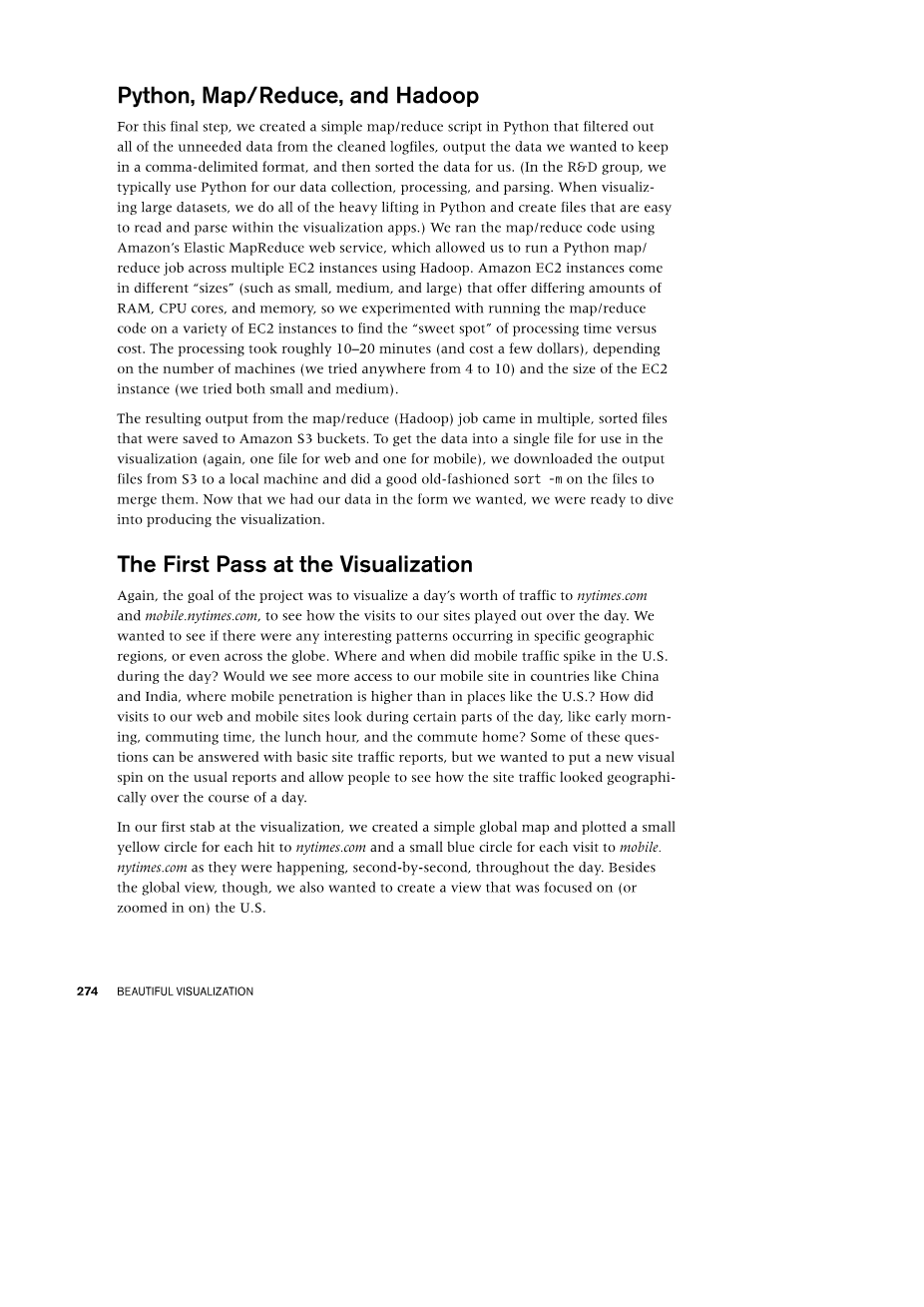 映射/归约(Hadoop)作业的结果输出进入了多个分类文件,这些文件已保存到Amazon S3存储桶中。要获得的数据转化为在可视化使用一个单独的文件(同样,一个文件的网络,一个用于移动电话),我们下载了S3的文件输出到本地机器,做了老式的排序-m 上的文件合并它们。现在,我们已经以所需的形式获得了数据,现在可以开始研究可视化了。