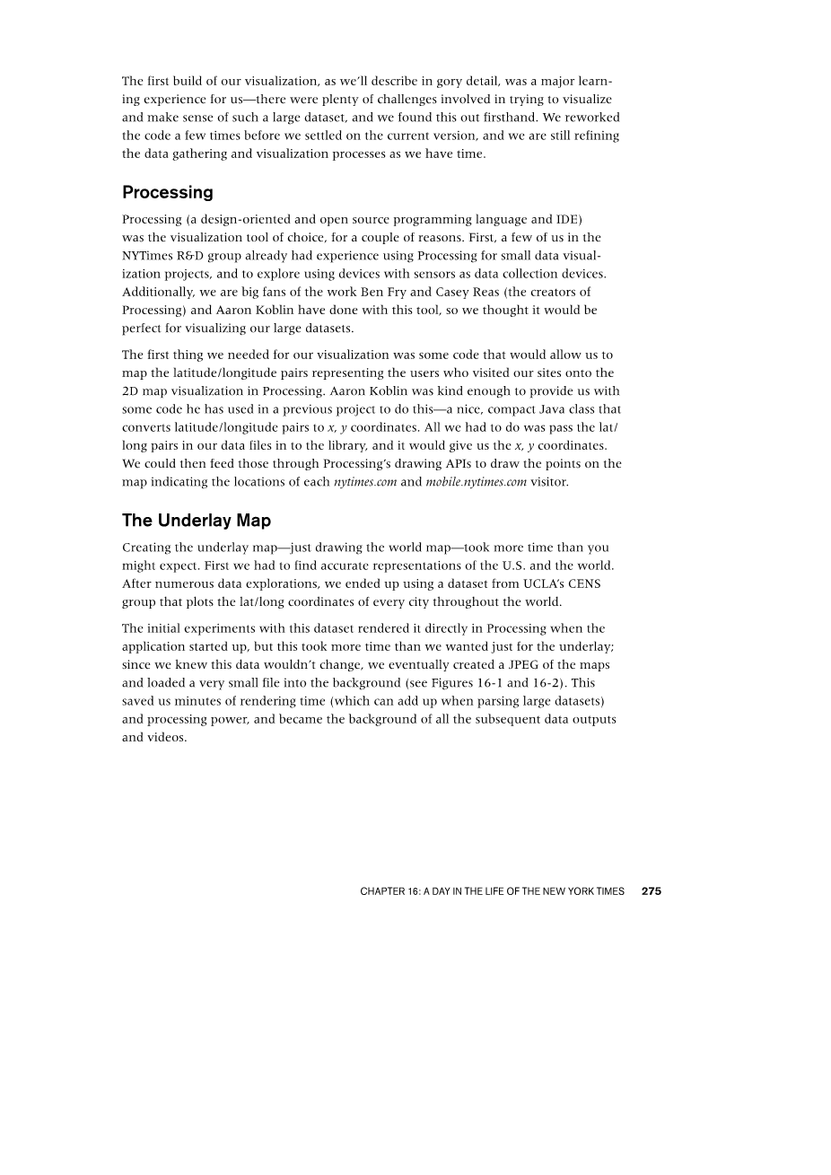 由于多种原因,处理(一种面向设计的开源编程语言和IDE)是首选的可视化工具。首先,我们在纽约时报(NYTimes)研发小组中的一些人已经有使用Processing处理小型数据可视化项目的经验,并且已经探索使用带传感器的设备作为数据收集设备的经验。此外,我们是Ben Fry和Casey Reas (Processing的创建者)和Aaron Koblin所做的工作的忠实拥护者,因此我们认为这对于可视化我们的大型数据集非常理想。
