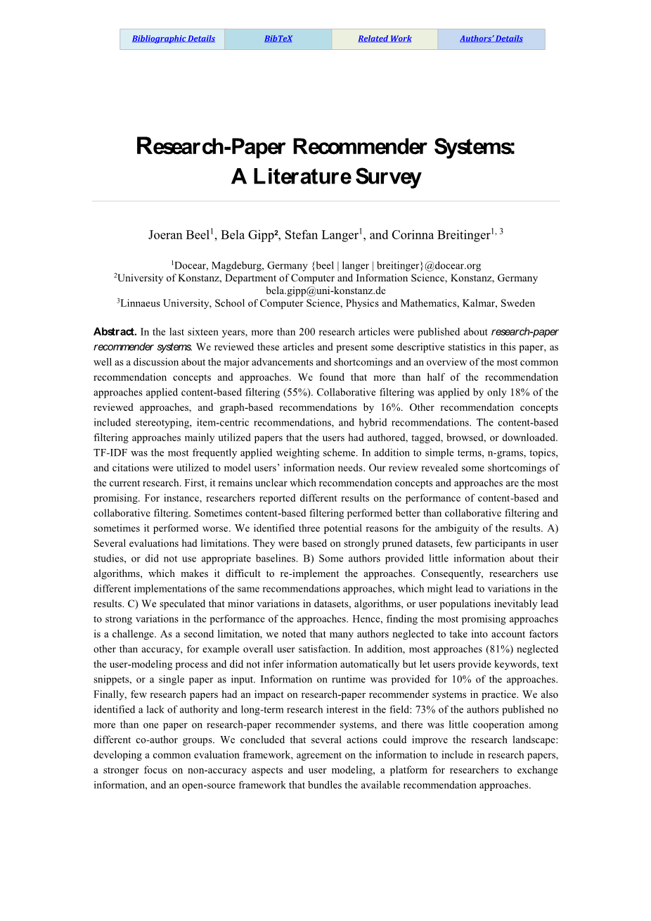 为了确定我们调查需要的相关文献,我们在谷歌Scholar、ACM数字图书馆、Springer Link和ScienceDirect上进行了文献检索。我们以[paper | article | citation] [recommender | recommendation] 和[system | systems]为搜索词,下载了所有与学术论文推荐系统相关的文章,如果题目本身与学术论文推荐系统没有明显的相关性,我们就会使用题目和摘要进行关联性判断。我们还检查了每一篇文章的参考书目,如果书目中的条目指向尚未下载的相关文章,则下载该文章。此外,我们还查阅了谷歌Scholar中哪些文章引用了相关文章,如果其中一篇引用的文章似乎是相关的,我们也进行下载。我们将搜索范围扩展到网站、博客、专利和主要学术推荐系统的演示文稿。这些主要的学术服务包括学术搜索引擎CiteSeer(x)、谷歌Scholar(Scholar Update)和PubMed;社交网络研究门户;参考文献管理者引用了like、Docear和Mendeley。虽然这些系统除了提供主要服务外,还提供推荐系统,但也有一些独立的推荐系统,即BibTip、bX、RefSeer、TheAdvisor和一个名为Sarkanto的实验系统。
