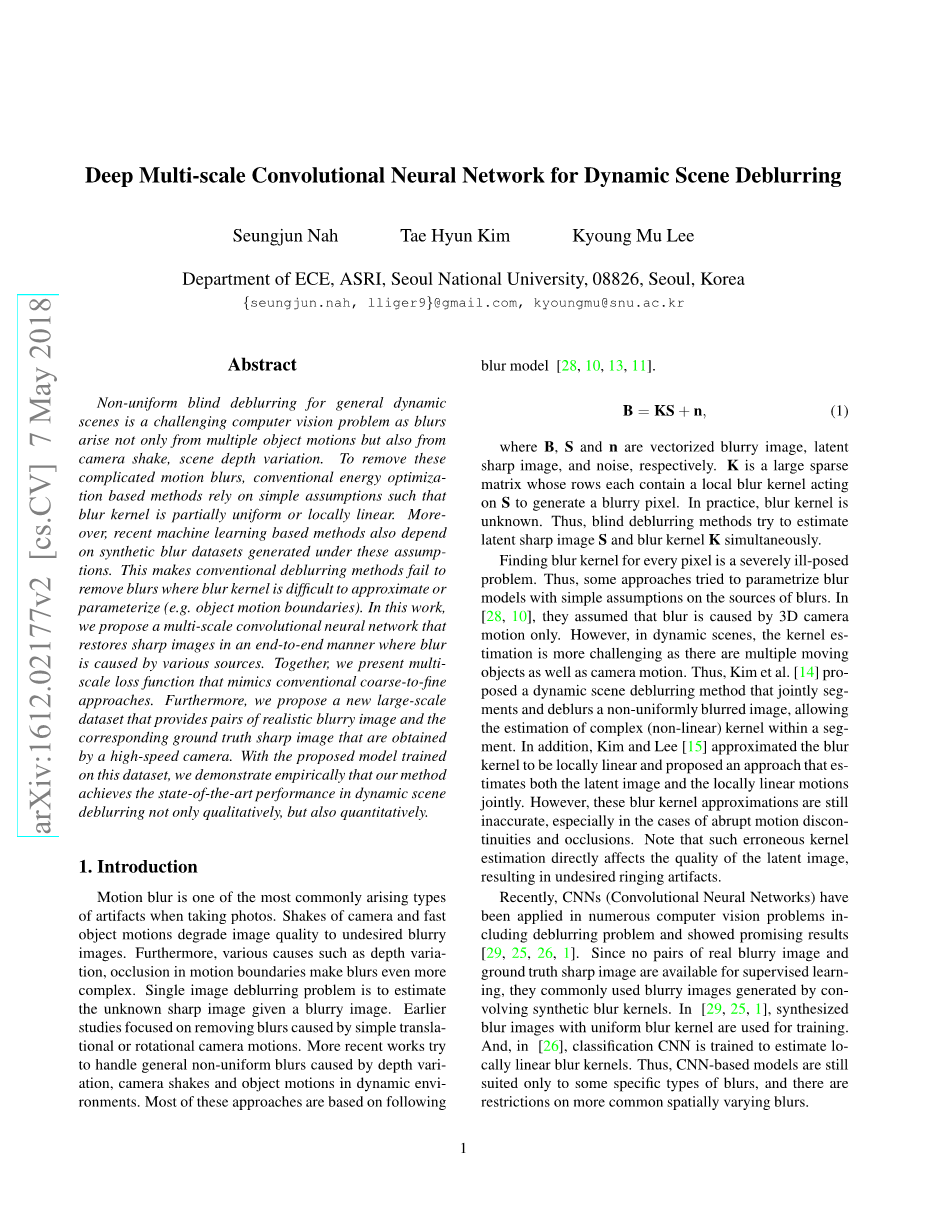 为了消除这些复杂的运动模糊,传统的基于能量优化的方法依赖于一些简单的假设,如模糊核部分均匀或局部线性过多,而最近的基于机器学习的方法也依赖于在这些假设下生成的合成模糊数据集。这使得传统的去模糊方法无法消除模糊,模糊核很难近似或参数化(如物体运动边界)。在这项工作中,我们提出了一个多尺度卷积神经网络,以端到端的方式恢复由各种来源引起的模糊图像。同时,我们提出了多尺度损失函数来模拟传统的由粗到细的方法。此外,我们提出了一个新的大规模数据集,提供了一对现实模糊图像和相应的地面真值锐化图像,由高速相机获得。通过在该数据集上的训练,我们证明了我们的方法在动态场景去模糊方面不仅在定性上,而且在定量上都达到了最先进的效果。