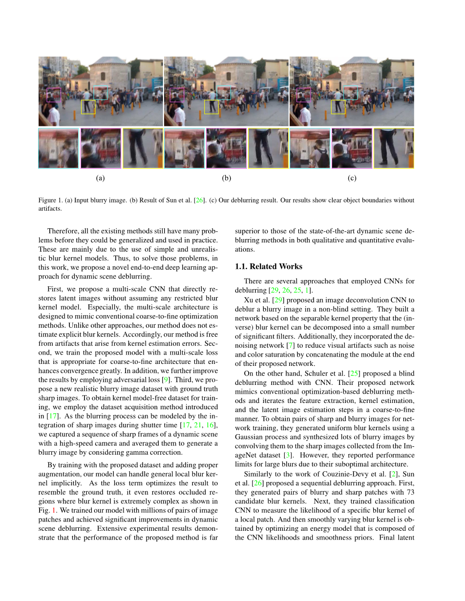最近,CNNs (Convolutional Neural Networks,卷积神经网络)已经有了被应用于许多计算机视觉问题,包括去模糊的问题,并显示了有希望的结果[29, 25, 26, 1]。因为没有对真实模糊的图像和真实清晰图像可用于监督学习,它们通常使用卷积产生的模糊图像合成模糊内核。合成了[29,25,1]使用均匀模糊核的模糊图像进行训练。在[26]中,分类CNN被训练成局部估计线性模糊内核。因此,基于cnn的模型仍然存在只适合某些特定类型的模糊,有对更常见的空间变化模糊的限制。