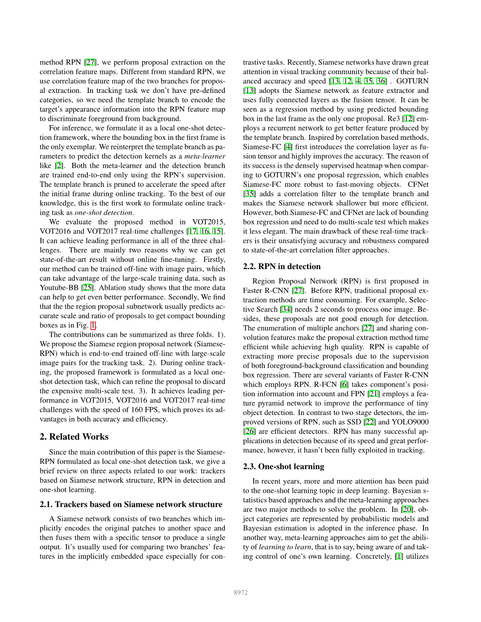 由于本文的主要贡献是将孪生RPN制定为本地一键式检测任务,因此,我们简要回顾了与我们工作相关的三个方面:基于孪生网络结构的跟踪算法,用于检测的RPN和一键式学习。