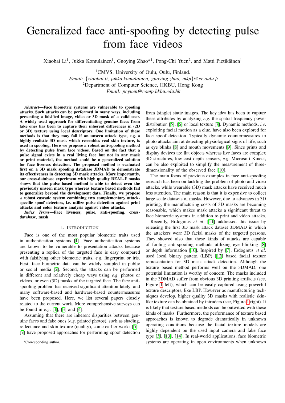人脸生物识别系统容易受到欺骗攻击。可以以多种方式执行此类攻击,包括呈现有效用户的伪造图像,视频或3D蒙版。区分真假面孔的一种广泛使用的方法是使用局部描述符捕获(2D或3D)纹理的固有差异。这些方法的局限性在于,如果出现一种看不见的攻击类型(例如,在欺骗中使用了高度逼真的3D蒙版,类似于真实的皮肤纹理。在这里,我们提出了一种通过检测面部视频中的脉冲来实现鲁棒的防欺骗方法。基于一个脉冲信号存在于一个真实的活人的脸部而不存在于任何掩模或印刷材料中的事实,该方法可以是用于面部活度检测的通用解决方案。所提出的方法首先计算在3D掩模欺骗数据库3DMAD证明在检测3D掩模攻击其有效性。更重要的是,我们使用高质量REAL-F面罩的跨数据库实验表明,基于脉冲的方法甚至可以检测以前看不见的面罩类型,而基于纹理的方法则无法推广到开发数据之外。最后,我们提出了一个鲁棒的级联系统,该系统结合了两个互补的特定于攻击的欺骗检测器,即利用脉冲检测来抵御打印攻击,并利用色彩纹理分析来应对视频攻击。