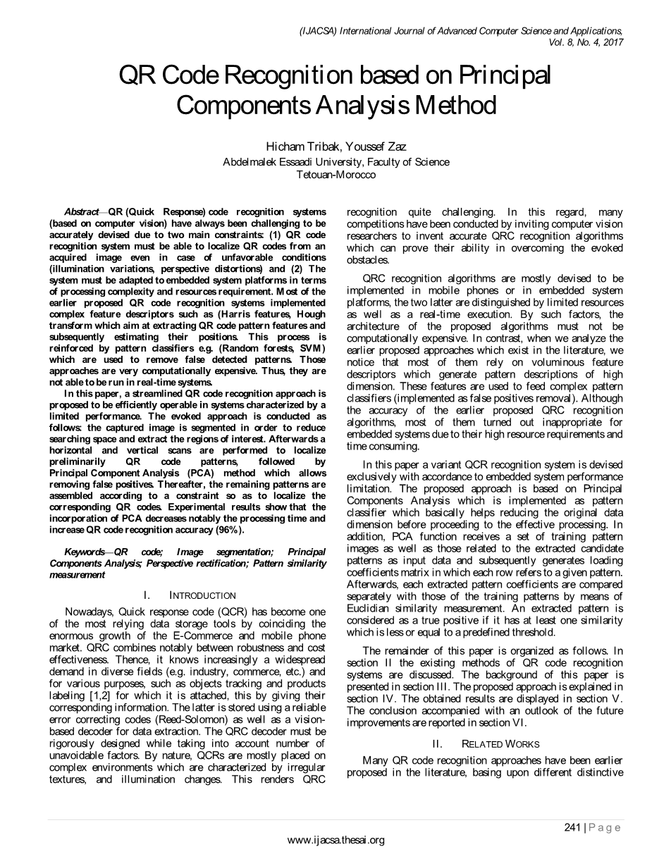 关键词:QR码; 图像分割;主成分分析法;透视校正; 图案相似度度量