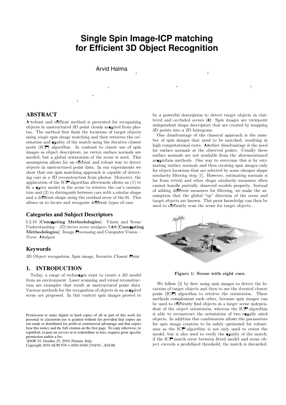 提出了一种鲁棒高效的非结构化三维点云目标识别方法。该方法首先利用单自旋图像匹配找到目标物体的位置,然后利用迭代最近点(ICP)算法检索匹配的方向和质量。与传统使用自旋图像作为对象描述符相比,不需要顶点表面法线,而是使用场景的全局方向。这种假设提供了一种有效和健壮的方法来检测非结构化点数据中的对象。在我们的实验中,我们证明了我们的旋转匹配方法能够从照片的三维重建中检测汽车。其次,ICP算法的应用使得我们(1)可以在场景中拟合查询模型来检索车辆的方向,(2)利用拟合的残差来区分形状相似和形状不同的车辆。这使我们能够定位和识别不同类型的汽车。