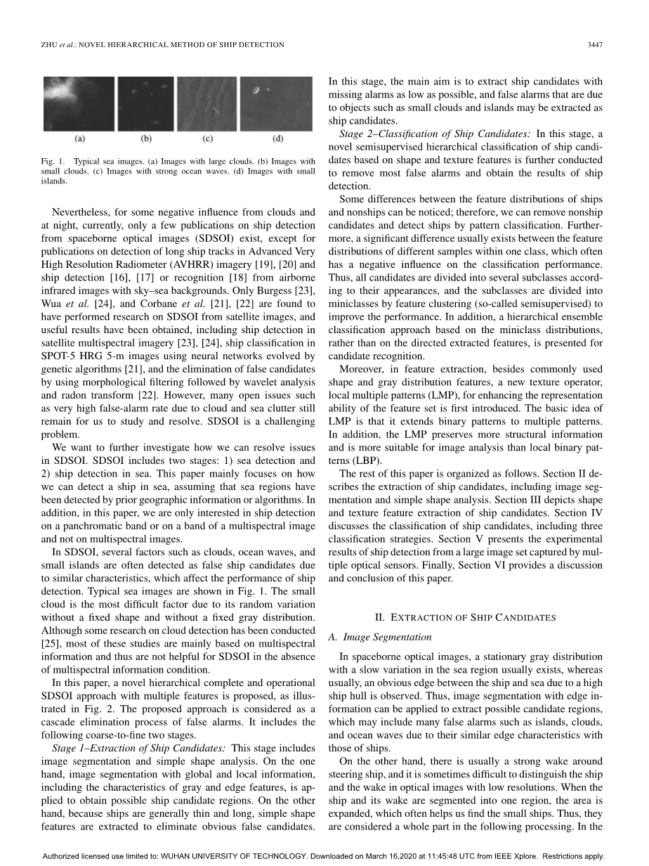 尽管如此,由于受到云层和夜间的一些负面影响,目前只有少数关于从星载光学图像(SDSOI)中检测船舶的出版物,除了关于利用先进的高分辨率辐射计(AVHRR)图像[19]、[20]和舰船检测[16]、[17]或从具有天空、海洋背景的机载红外图像中识别[18]的长航迹的出版物。只有Burgess[23],Wua等人。[24]和Corbane等人。[21]、[22]对卫星图像中的SDSOI进行了研究,取得了有益的结果,包括舰船检测卫星多光谱图像[23]、[24]、SPOT-5 HRG 5-m图像的神经网络分类和遗传算法[21],以及利用形态滤波结合小波分析和拉东变换消除错误的候选对象[22]。然而,由于云海杂波造成的高误报率等许多悬而未决的问题仍有待我们研究和解决。SDSOI是一个挑战问题。