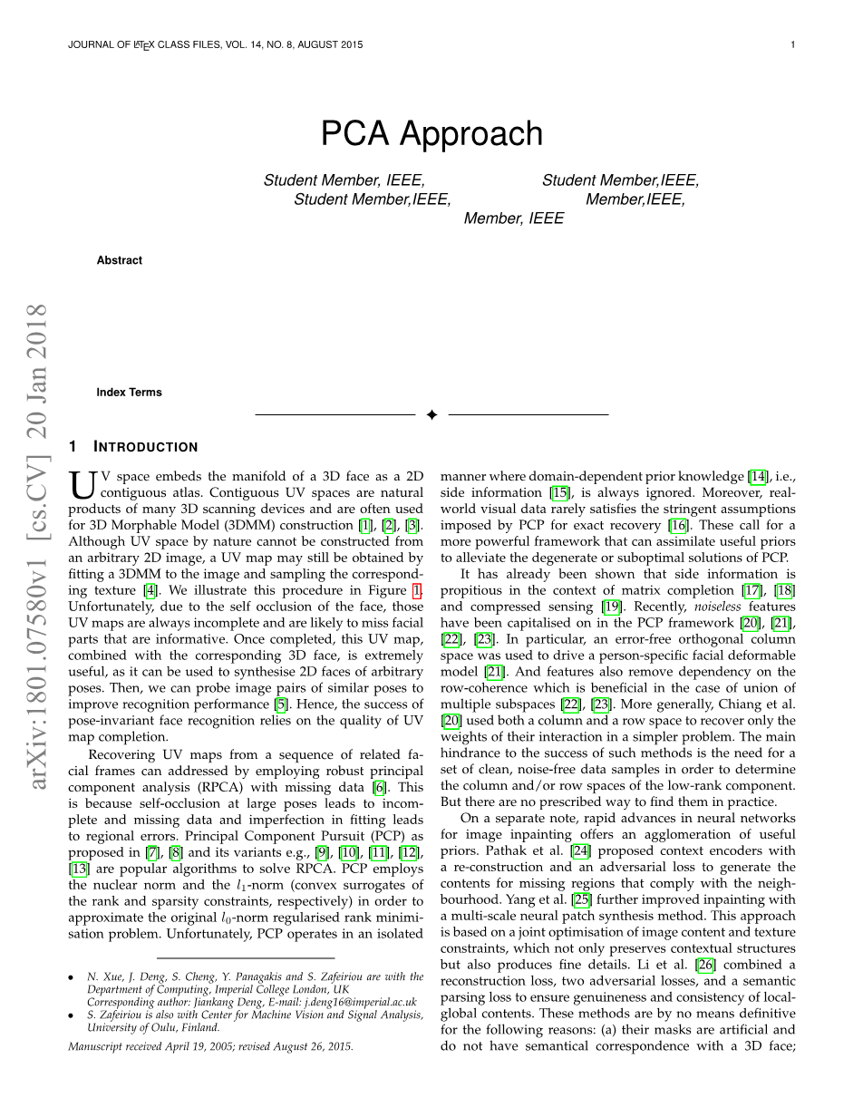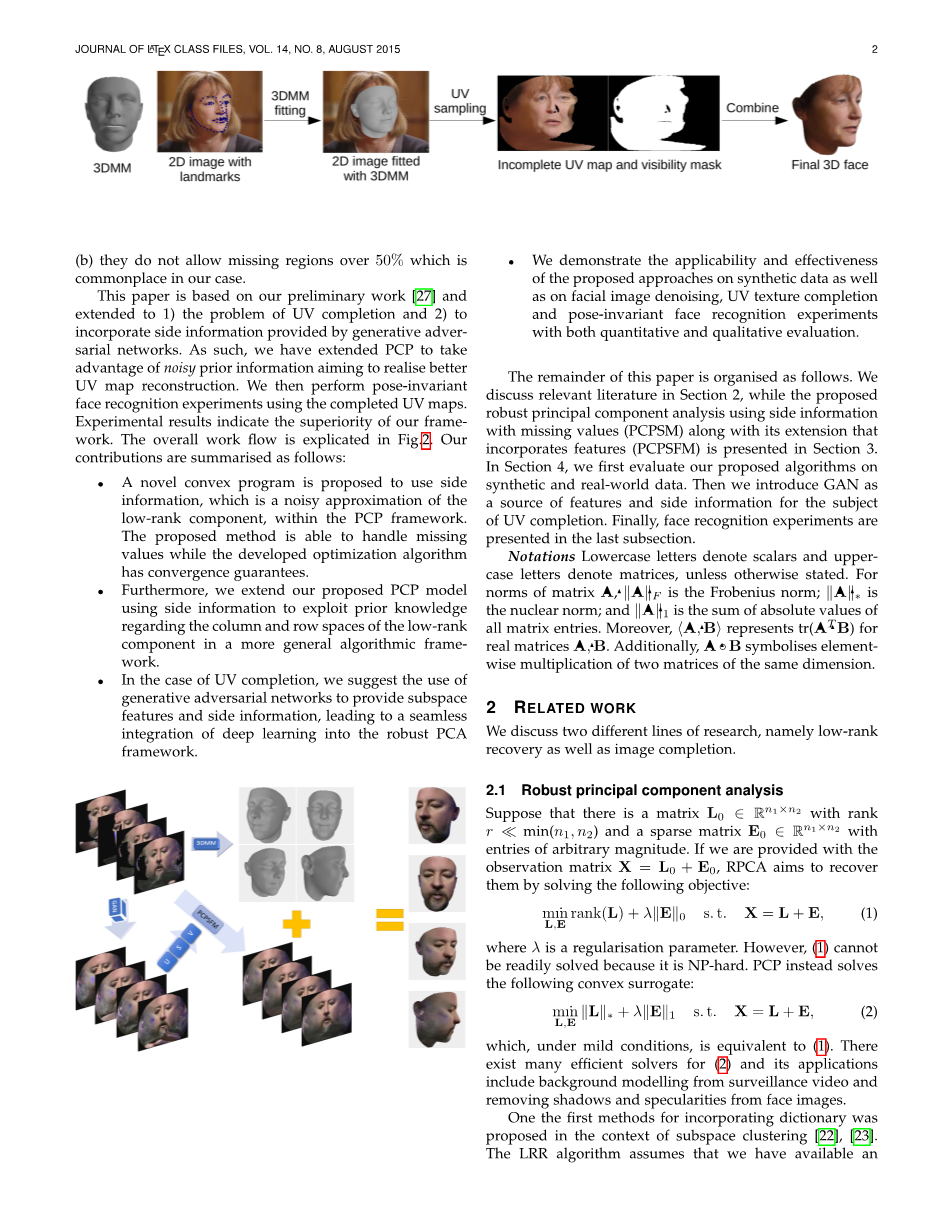 通过使用缺失数据的鲁棒主成分分析(rpca),可以从一系列相关的面部框架中恢复紫外线图谱。这是因为大姿势的自遮挡导致不完整和缺失的数据和不完善的拟合导致区域误差。主成分追踪(PCP)是[7],[8]所推荐的,且它的变体例如[9],[10],[11],[12],[13]是解决RPCA的常用算法。PCA使用核标准和l1- 范数(分别是秩和稀疏约束的凸代数)逼近原始的 l0- 范数正则化秩最小化问题。遗憾的是,pcp 以一种孤立的方式运作,其中依赖于领域的先验知识[14] ,辅助信息[15]总是被忽略。此外,现实世界的视觉数据很难满足pcp为精确恢复所提出的严格假设。这些要求一个更强大的框架,可以吸收有用的优先权,以减轻退化或次优的pcp 解决方案。已经证明,在矩阵完成[17]、[18]和压缩感知的背景下,辅助信息是有利的。最近pcp 框架中利用了无噪声的特性[20], [21],[22], [23]。特别是,一个无错误的正交柱状空间被用来驱动一个人特有的面部变形模型[21]。特性也消除了对行相干性的依赖,这在多个子空间并集的情况下是有益的。更广泛地说,Chiang 等人在一个较简单的问题中,同时使用了一个列和一个行空间来恢复它们之间相互作用的重量。这种方法成功的主要障碍是需要一组干净、无噪音的数据样本来测定低等级部件的列或行空间。但在实际中没有规定的方法来找到它们。另一方面,图像修复的神经网络的快速发展,为我们提供了大量有用的前提。帕塔克等人建议上下文编码器的重建和对抗性损失,以产生遵守缺失区规定的内容。杨等人[25]进一步改进了修补与多尺度神经片合成方法。这种方法基于图像内容和文本约束的联合优化,不仅保留了上下文结构,而且产生了精细的细节。李等人[26]合并了面积构造损失、两个对抗性损失和语义解析损失,以确保本地或全局内容的真实性和一致性。由于以下原因,这些方法决不是绝对的:(a)他们的面具是人造的,与3d 面具没有语义上的对应;(b)他们不容许超过50% 的遗漏区域,这在我们的案例中是司空见惯的。这篇论文是基于我们的初步工作[27],并研究了1)紫外线完成的问题和2)合并生成对手网络提供的辅助信息。因此,我们扩展了pcp,以利用有噪声的先验信息,从而实现更好的紫外线图像重建。然后我们使用已完成的紫外成像图进行姿态不变的人脸识别实验,实验结果表明了我们的框架的优越性。 图2详细说明了整个工作流程。我们的贡献摘要如下: