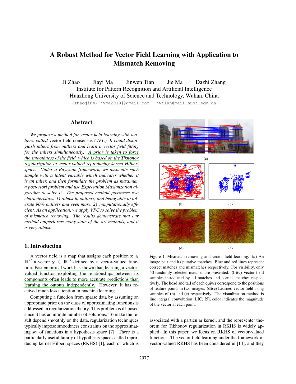 我们提出了一种具有离群点的矢量场学习方法,称为矢量场一致性(VFC)。 它可以将内点从离群点中区分开,并同时学习向量对内点进行拟合。基于矢量值再现内核希尔伯特空间中的Tiknonov正则化,采取了先验以增强场的平滑性。在贝叶斯框架下,我们将每个样本与一个隐变量关联起来,该变量指示其是否是一个内点,然后将该问题建模为最大后验问题,并使用期望最大化算法(EM)进行求解。所提出的方法具有两个特征:1)对离群点具有鲁棒性,并且能够容忍90%的异常值,甚至更多;2)计算效率高。作为一个应用程序,我们应用VFC解决误匹配剔除问题。结果表明,我们该方法优于许多最先进的方法,并且非常鲁棒。