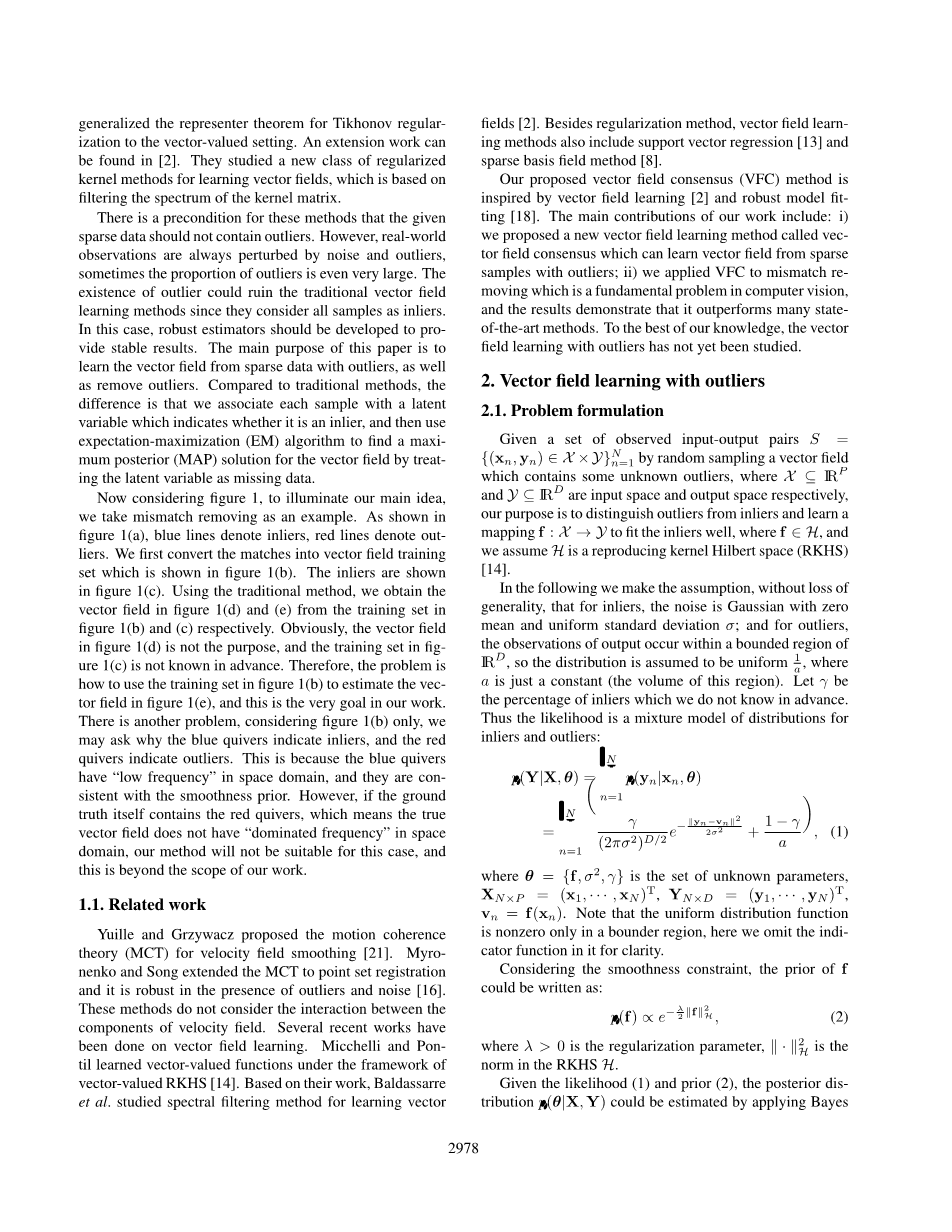 在正则化理论中讨论了通过在近似函数的类别上假设适当的先验来从稀疏数据计算函数。这个问题是病态的,因为有无数个解。为了使结果平稳地依赖于数据,正则化技术通常对假设空间中的近似函数集施加平滑约束[7]。有一个特别有用的假设空间类叫做再生核希尔伯特空间(RKHS) [1],其中每一个RKHS与一个特定的核(kernel)一一对应;定义于RKHS上的Tikhonov正则化方法以及由其导出的表示定理(representertheorem)在逼近理论和统计学习理论中都有广泛的使用。在这篇论文,我们关注向量值函数的RKHS。文[14]考虑了向量值RKHS框架下的矢量场学习,并且他们推广了Tikhonov正则化的向量值设置的表示定理。 一个扩展工作可以在[2]中找到。他们研究了一种新的类别的正则化核方法来进行向量场的学习,这种核方法基于过滤核矩阵的谱。这些方法有一个先决条件,即给定的稀疏数据不应包含离群点。然而,现实世界的观测总是受到噪声和离群点的干扰,有时候离群点的比例甚至非常大。离群点的存在会破坏传统的矢量场学习方法,因为他们认为所有的采样点都是内点。在这种情况下,应该开发鲁棒估计子,以提供稳定的结果。本文的主要目的是从具有离群点的稀疏数据中学习向量场,以及去除离群点。和传统的方法相比,不同之处在于,我们将每个样本与一个隐变量相关联,该变量指示它是否是一个离群点,然后使用期望最大化(EM)算法找到最大后验概率(MAP)。通过将隐变量视为缺失数据来解决向量场。现在考虑到图1,为了阐明我们的主要观点,我们以消除误匹配为例。如图1(a)所示,蓝线代表内点,红线代表离群点。我们首先将匹配转换为矢量场训练集,如图1(b)所示。图1(c)显示内点。使用传统方法,我们分别从图1(b)和(c)中的训练集获得图1(d)和(e)中的矢量场。显然,图1(d)中的矢量场不是目的,图1(c)中的训练集是事先不知道的。 因此,问题是如何使用图1(b)中的训练集来估计图1(e)中的矢量场,这是我们工作中的目标。还有一个问题,仅考虑图1(b),我们可能会问,为什么蓝色的箭头指示内点,而红色箭头表示离群点。这是因为蓝色箭头在空间域中具有“低频”,并且与先验的平滑度一致。然而,如果地面真相本身包含红色箭头,意味着真正的矢量场在空间域中没有“主导频率”,我们的方法将不适用于这种情况,并且这也超出了我们的工作范围。