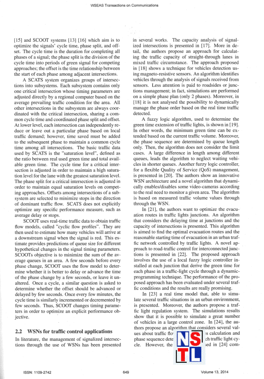 对无线传感器网络已经进行了详尽的研究,并将其用于多个领域,例如健康[9],农业[10]和家庭自动化[11]。毫无疑问,该技术的主要应用领域之一是道路监控。 在文献中,信号交叉管理提出了不同的方法,他们都建议减少等待时间和队列长度。