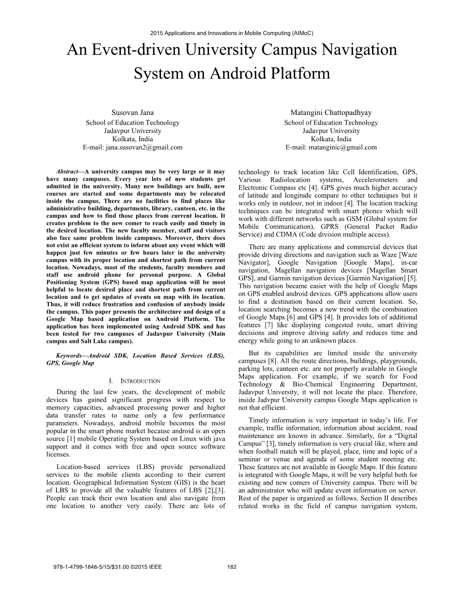 例如在波卡拉顿佛罗里达大西洋大学的校园设计和开发校园助理应用程序是在Android平台上的。应用程序提供了设备选择出发地和目的地位置和它给最短驾驶和步行路径,也为用户提供了合适的停车场。在GPS的帮助下它还显示了用户的当前位置。如果离开投影路径,应用程序为用户提供了重新规划路径的功能。他们设计了一个地图编辑器工具来编辑和管理校园地图。另一个研究小组在目的地的路径添加上下文信息以及用户的当前位置,为该应用程序的用户提供更多援助。
