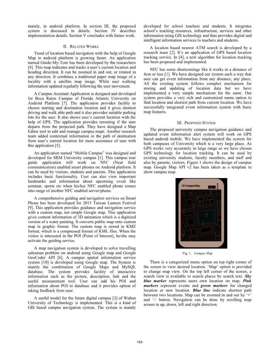 大学校园导航的提出指导了基于GPS的android事件信息更新预警系统将移动工作。大学校园是一个非常大的地方。在大范围内GPS非常准确地提供位置信息,所以我们选择了GPS的位置跟踪技术。它可以通过现有的大学学生,教职员工,和员工也可以由父母,游客反馈信息。图1显示了设计的校园地图。Google地图API作为一个模板来展示校园地图。