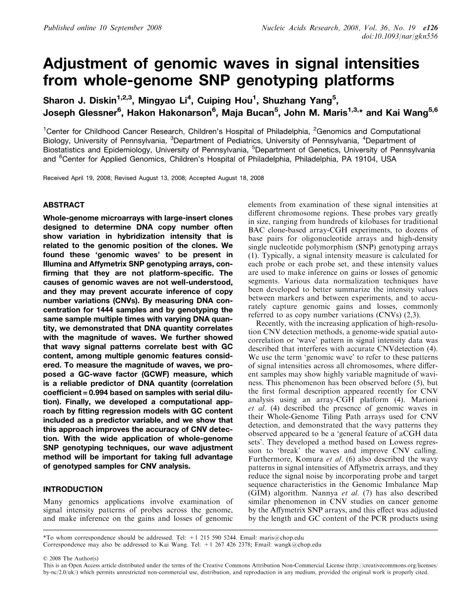 摘要:在全基因组芯片具有大量插入克隆片段的设计,这往往说明在相关的克隆的基因组位置DNA拷贝数在杂交强度上是变化的。我们在Illumina公司和Affymetrix的SNP基因分型阵列发现这些“基因组波”,并且确认他们不是特定于平台。该基因组波产生的原因并不是很好理解,他们可能会阻止副本准确推断数变异(CNV)。通过测量1444样本上的同一个样品多次与不同的DNA数量的DNA浓度和基因分型,我们发现,DNA相关波的幅度与此有关。考虑多个基因组的功能,我们进一步发现该波浪信号模式最相关的GC内容。为了测量波的幅度,我们设一个GC-波因子(GCWF)量度,表示DNA量的可靠的预测(基于相关连续波的稀释采样系数= 0.994)。最后,我们开发了一种通过拟合回归模型GC含量,包括将它作为预测变量的计算方法,我们认为,这种方法提高了CNV的检测的准确性。随着SNP基因分型技术在全基因组上的广泛应用,我们的滤波方法将是重要的充分利用基因分型的样本进行CNV分析的方法