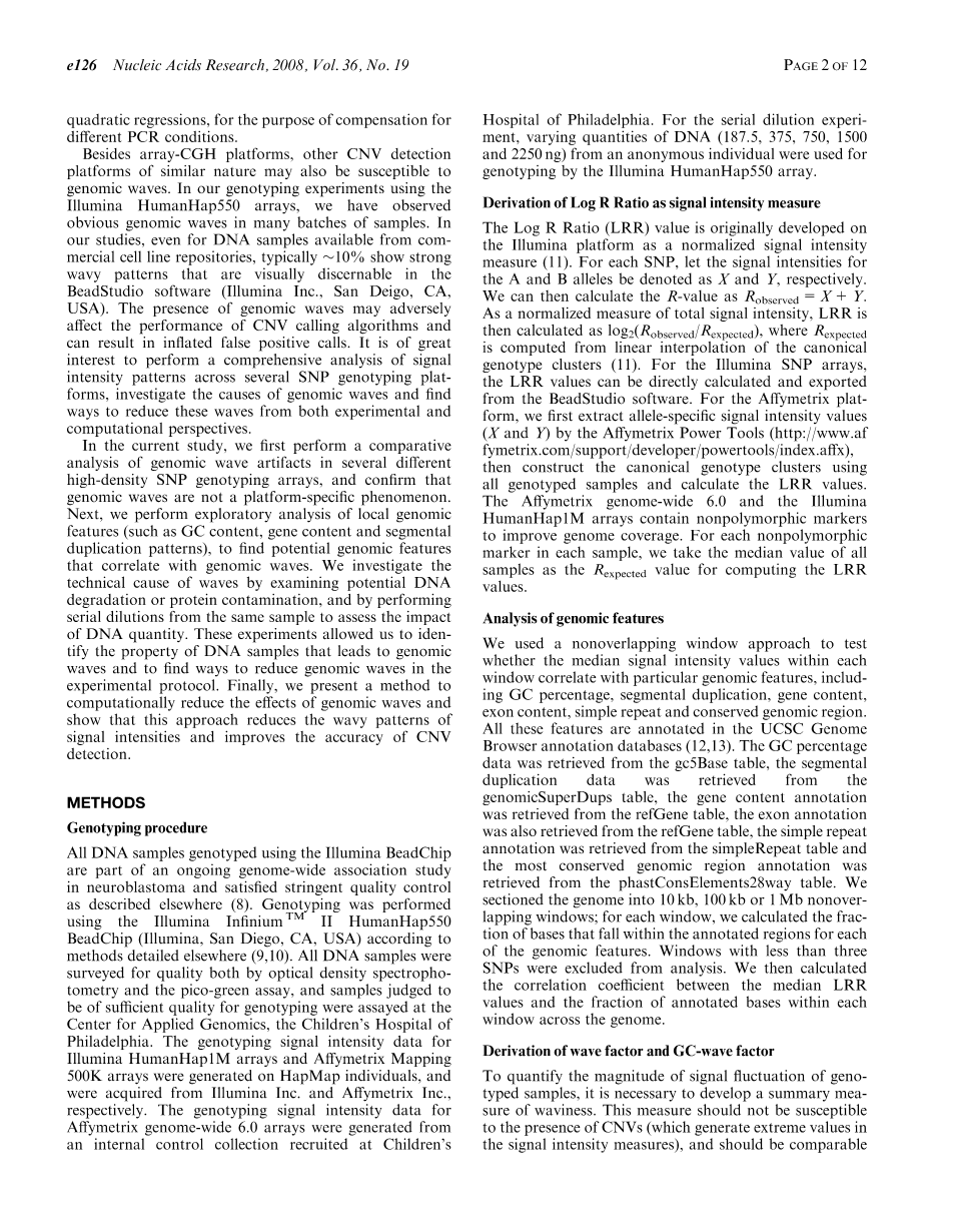 我们提出了两个措施来解决任何波状图案基因分型的样本。这些措施的主要优点是它们不依赖于外部数据模型或参考样品,并可以应用到许多不同的技术平台和不同阵列设计。我们进一步研究GCWF度量与强相关DNA的量,并且可以用来评估是否有效性的降低基因组波。此外我们有也尝试过自相关的其他措施,如GCWF,包括相邻的标记的信号强度的相关性与滞后1,滞后10,滞后100和500滞后距离。虽然,自相关性确实反映附近标记物相关趋势(含正值),它们因为DNA数量等原因不利于评价波的幅度或方向性。