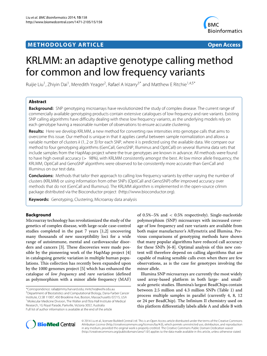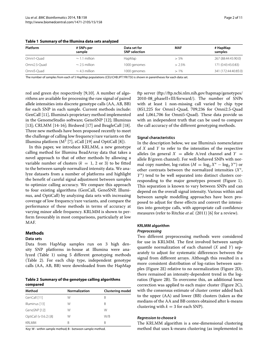 结论:通过不同数量的集群(KRLMM)或使用从其他单核苷酸多态性(OptiCall和GenoSNP)得到的信息调整自己的方法调用低频变异的措施提高精度,而不是(GenCall和Illuminus)的方法。KRLMM算法实现的开源crlmm包经由Bioconductor项目。(http://www.bioconductor.org)
