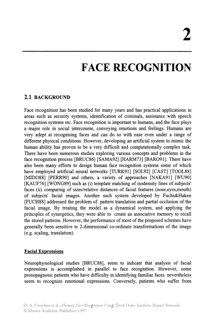 人脸识别已经研究了许多年,在实际中有一定的应用如安全系统,犯罪分子识别,援助与讲话识别系统等。人脸识别对人类来说非常重要,而人脸也在人类社交中扮演重要的角色,用于传达情感和感觉。人类是非常善于在一系列不同的物理条件内轻松地进行人脸识别。然而,开发一个模拟人类能力的人工系统已被证明是一个非常困难和计算复杂的任务。到现在,已经存在众多的研究,探索各种在人脸识别的过程概念和问题。也有多努力去设计一些采用人工神经网络和其他各种如等密度模板匹配人脸面部特征(鼻子,眼睛,嘴巴)的大小相对距离的人脸识别系统。福斯与哈肯开发的另外一种这样的系统,解决了人脸图像模式翻译和部分遮挡问题。将模型作为一个动力系统,应用协同学原理,他们能够创造一个联想记忆存储模式。然而,大多数提出方案的性能,一般都是基于敏感的图像2维坐标变换。
