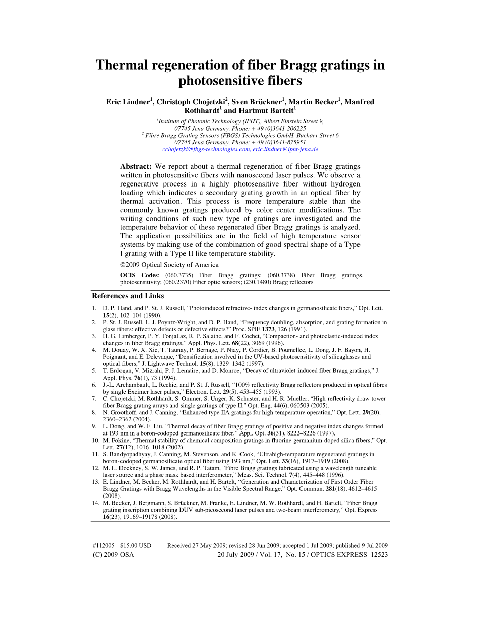 我们已经观察到类似类型的再生折射率变化,然而通过在248nm处使用纳米级激光脉冲用于在高度光敏锗掺杂光纤中的初级光栅而没有硼掺杂,并且不需要氢负载用于再生过程。 正在研究这种类型的光栅的写入条件和制造工艺,并且针对它们在高温感测领域中的应用来分析它们的性质。