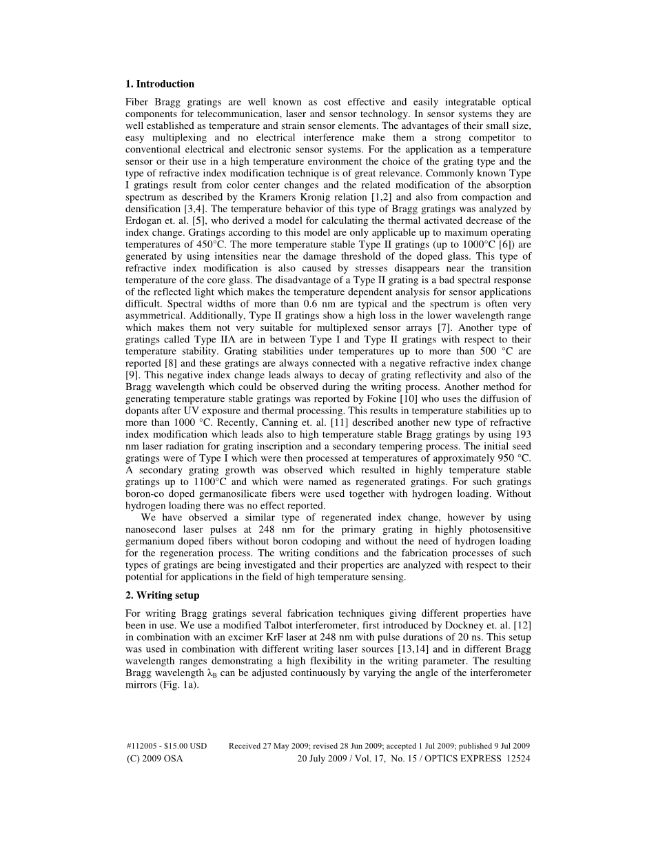 光纤布拉格光栅是用于电信,激光和传感器技术的成本有效且易于集成的光学元件。 在传感器系统中,它们被良好地建立为温度和应变传感器元件。 其小尺寸,易于多路复用和无电气干扰的优点使其成为传统电气和电子传感器系统的强大竞争对手。 对于作为温度传感器的应用或它们在高温环境中的使用,光栅类型和折射率修改技术的类型的选择是非常重要的。 通常已知的I型光栅由Kramers Kronig关系[1,2]以及压实和致密化[3,4]描述的色心改变和吸收光谱的相关改性产生。这种类型的布拉格光栅的温度特性由Erdogan等人分析[5],他们导出了一个模型,用于计算指数变化的热激活减少。 根据此型号的光栅仅适用于最高工作温度450°C。 通过使用接近掺杂玻璃的损伤阈值的强度产生更温度稳定的II型光栅(高达1000℃[6])。 这种类型的折射率修改也是由芯部玻璃的转变温度附近的应力消失引起的。 II型光栅的缺点是反射光的不良光谱响应,这使得对于传感器应用的温度相关分析困难。大于0.6nm的光谱宽度是典型的,并且光谱通常非常不对称。 此外,II型光栅在较低的波长范围内表现出高损耗,这使得它们不太适合多路传感器阵列[7]。关于其温度稳定性,称为IIA型的另一种类型的光栅在I型和II型光栅之间。 在高达500℃以上的温度下的光栅稳定性被报道[8],并且这些光栅总是与负折射率变化连接[9]。 该负折射率变化总是导致光栅反射率以及在写入过程期间可以观察到的布拉格波长的衰减。 Fokine [10]报道了另一种产生温度稳定光栅的方法,该方法在UV曝光和热处理之后使用掺杂剂的扩散。这导致高达1000℃以上的温度稳定性。 最近,Canning等人[11]描述了另一种新型的折射率修正,其还通过使用193nm激光辐射用于光栅刻写和二次回火工艺而导致高温度稳定的布拉格光栅。初始种子光栅是I型,然后在大约950℃的温度下处理。 观察到二次光栅生长,其导致高达1100℃的高温稳定光栅,并被称为再生光栅。 对于这种光栅,硼掺杂的锗硅酸盐纤维与氢负载一起使用。 没有氢负载没有报告的效果。
