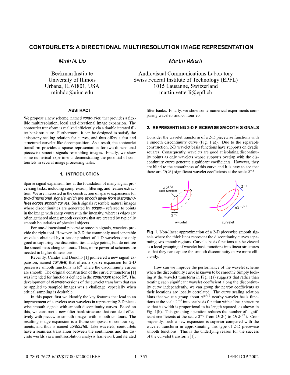 我们提出了一个新的计划,命名为轮廓波,它提供了一个灵活的多分辨率,局部和方向的图像扩展。通过双迭代滤波器组结构实现轮廓波变换。此外,它可以被设计为满足各向异性标度关系曲线,从而提供了一个快速和结构化的曲波分解。其结果是,因此,轮廓波变换提供了一个为二维分段光滑信号稀疏表示类似的图像。最后,我们将展示一些数值试验证明轮廓波变换在几个图像处理任务的潜力。