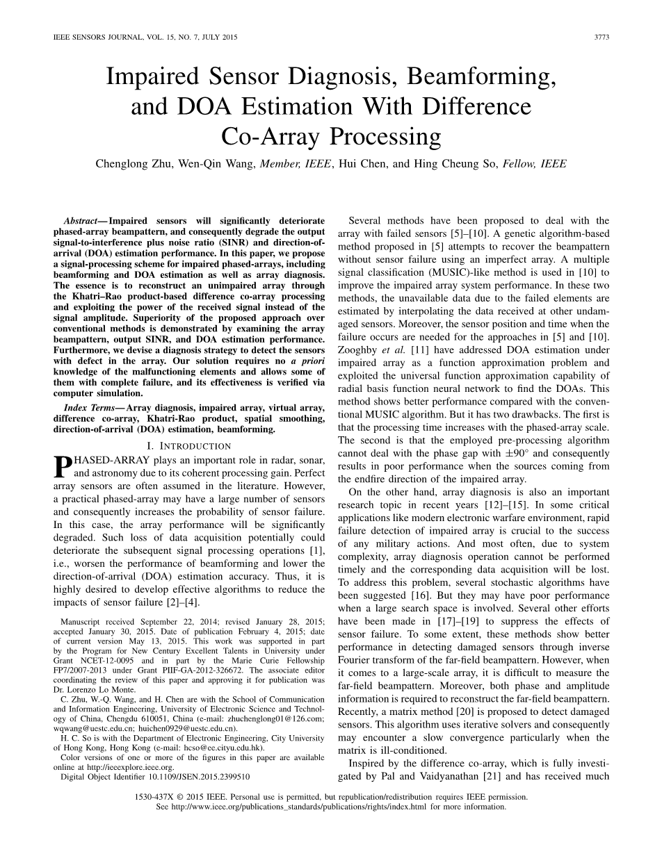相控阵由于其相干处理增益,在雷达、声纳和天文学中占有重要地位。文献中经常假设理想阵列传感器。然而,一个实际的相控阵可能有大量的传感器,因此增加了传感器失效的可能性。在这种情况下,阵列性能将显著降低。这样的数据采集丢失可能会恶化后续的信号处理操作[1],即恶化波束形成性能,降低到达方向(DOA)估计精度。因此,我们非常希望开发有效的算法来减少传感器故障的影响[2]-[4]。