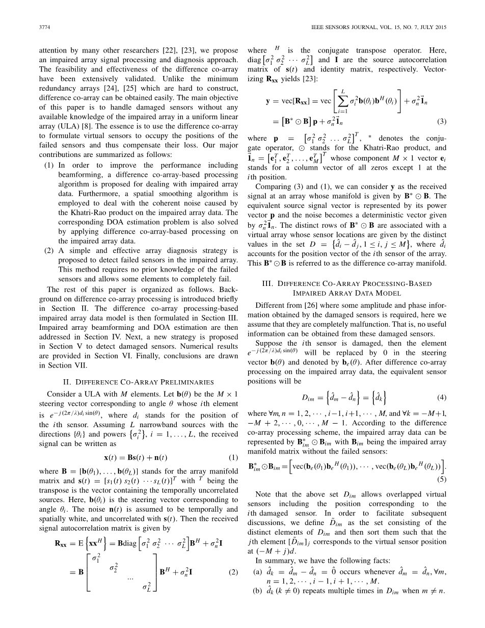 本文的其余部分组织如下。第二节简要介绍了差分共阵列处理的背景。第三节提出了基于差分共阵列处理的受损阵列数据模型,第四节讨论了受损阵列波束形成和DOA估计,第五节提出了一种新的受损传感器检测策略。第六节给出了数值结果,第七节给出了结论。