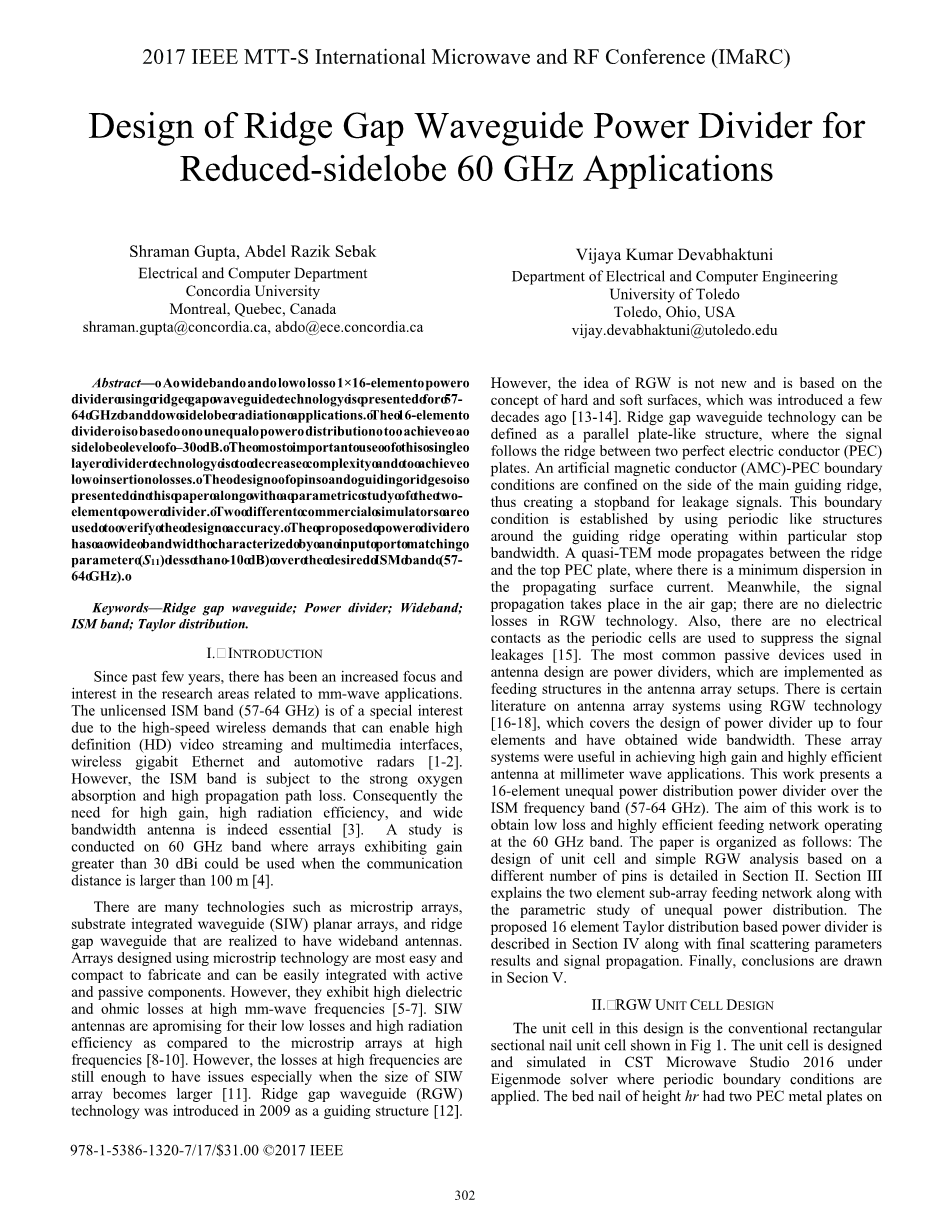 关键词:脊隙波导;功率分配器;宽带;ISM波段;泰勒分布。