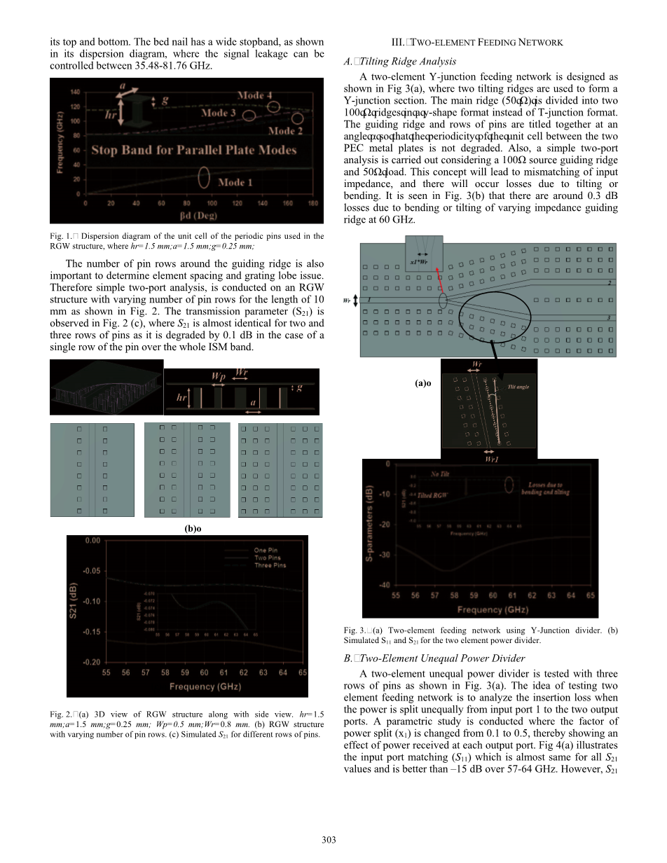 如图3(a)所示,设计了一个两元件Y形连接馈电网络,其中两个倾斜脊用于形成一个Y形连接部分。主脊(50 fi)分为两个100 fi脊,采用Y形格式,而不是T形连接格式。导脊和针排以A角排列在一起,这样两块PEC金属板之间的单元单元单元周期性就不会降低。同时,考虑到100FI源导脊和50FI负载,进行了一个简单的双端口分析。这一概念将导致输入阻抗的不匹配,并且会由于倾斜或弯曲而发生损耗。从图3(b)中可以看出,在60GHz时,由于不同阻抗的导脊弯曲或倾斜,损失约为0.3dB。