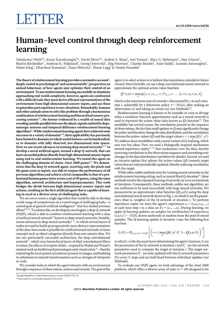 强化学习理论对关于智能体在一个环境中如何优化他们的行为提供了规范性的说明,其根源是对动物行为研究得到的关于心理学和神经学的观点。在接近真实世界复杂度的情境下,强化学习已经获得了一些成果;然而智能体也面对一些困难的挑战:必须从环境中的高维感觉输入中得到有效的特征,并且要使用它们概括过去的经验来应付新的场景。明显地, 人类和其他动物看起来通过优雅地联合强化学习与多层次感觉处理系统来处理这些问题,大量神经数据证明神经元发射的多巴胺相位信号与时间差分强化学习算法有明显的相似。当强化学习智能体在多领域获得成功,它们的适用性以前仅限于可以手工制作有用特性的领域, 或者可以被完全观察、处于低维状态空间的领域。因此我们最近提出了通过训练深度神经网络来开发一个称为“Deep Q-Network”的新型人工智能体,它可以通过高维感觉输入直接学习成功的策略来实现端到端的强化学习。我们在传统 Atari2600 游戏挑战领域测试了这个智能体。我们确信深度 Q 网络智能体仅仅从像素和游戏得分获取输入,使用相同的算法、网络结构和超参数实现了对于 49 个游戏与专业人类游戏测试人员同等级别的表现,能够超越以前所有算法。这项工作链接了高维感觉输入和行动,从而产生了第一个能够在各种挑战中学习性能优异的人工智能体。