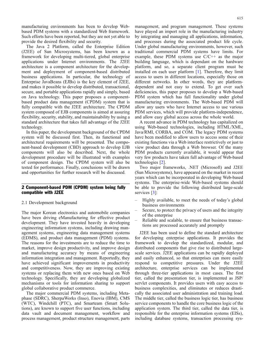 Java 2平台称为Sun Microsystems的企业版(J2EE),它被称为在Internet环境下开发多层全局企业应用程序的框架。 J2EE体系结构是用于开发和部署基于组件的分布式业务应用程序的组件体系结构。特别是,Enterprise JavaBeans(EJB)技术是J2EE的关键元素,可以基于Java技术快速简单地开发分布式,事务性,安全性和可移植性应用程序。本文提出了一个基于组件的产品数据管理(CPDM)系统,它与J2EE架构完全兼容。由EJB组件组成的CPDM系统旨在通过使用充分利用J2EE技术的标准体系结构来确保灵活性,安全性,稳定性和可维护性。