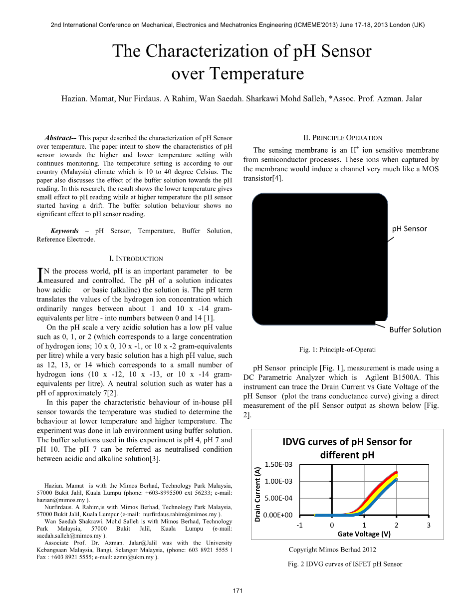 摘要:本文介绍了pH传感器在温度下的特性。本文旨在研究在较高温度和较低温度下,pH传感器的不同特点。温度设置是按照本国(马来西亚)的气候设置的,也就是10摄氏度到40摄氏度。本文还讨论了缓冲溶液对pH数值读取的影响。研究结果表明,低温对pH检测结果影响微弱,而高温会导致实验结果出现明显的温度漂移。