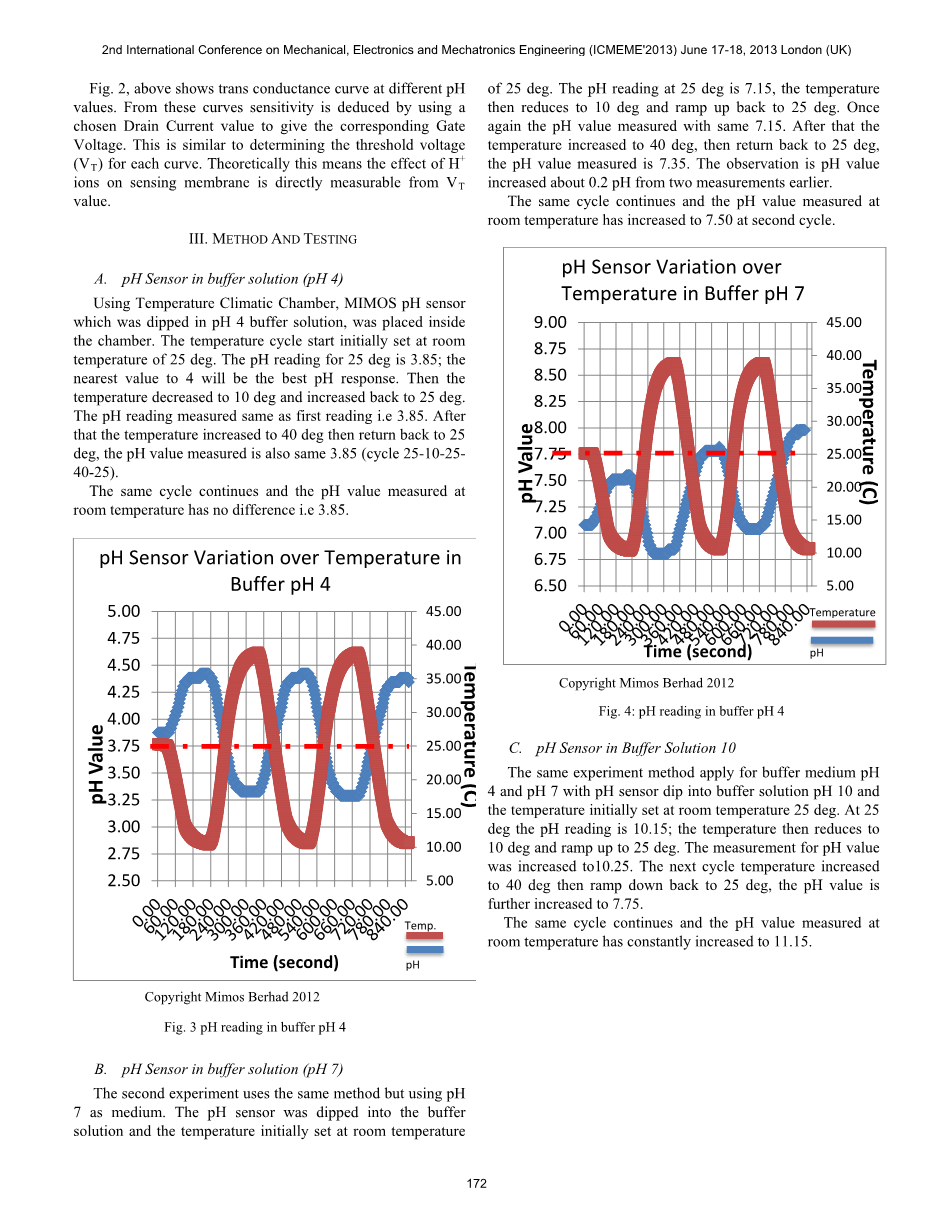 在本文所述实验中,通过改变室温到低温和高温,来研究温度对室内的pH传感器的特性表现的影响。在实验室中做的实验使用缓冲溶液。实验中使用了pH为4,7,10的三种缓冲溶液。pH数值为7的溶液可以看成是酸碱溶液中和得到的。