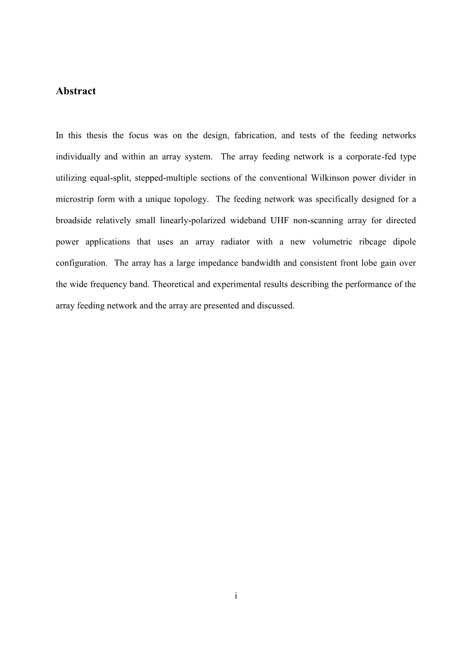 在本论文中,重点在于单独地在阵列系统内的馈电网络的设计,制造和测试。 阵列馈电网络是使用具有独特拓扑结构的微带形式的常规威尔金森功率分配器的等分裂,分级多个部分的公司馈电类型。 馈电网络被专门设计用于宽边相对小的线性极化宽带UHF非扫描阵列,用于使用具有新的体积肋状物偶极配置的阵列辐射器的定向功率应用。 该阵列在宽频带上具有大的阻抗带宽和一致的前瓣增益。 介绍和讨论描述阵列馈电网络和阵列的性能的理论和实验结果。