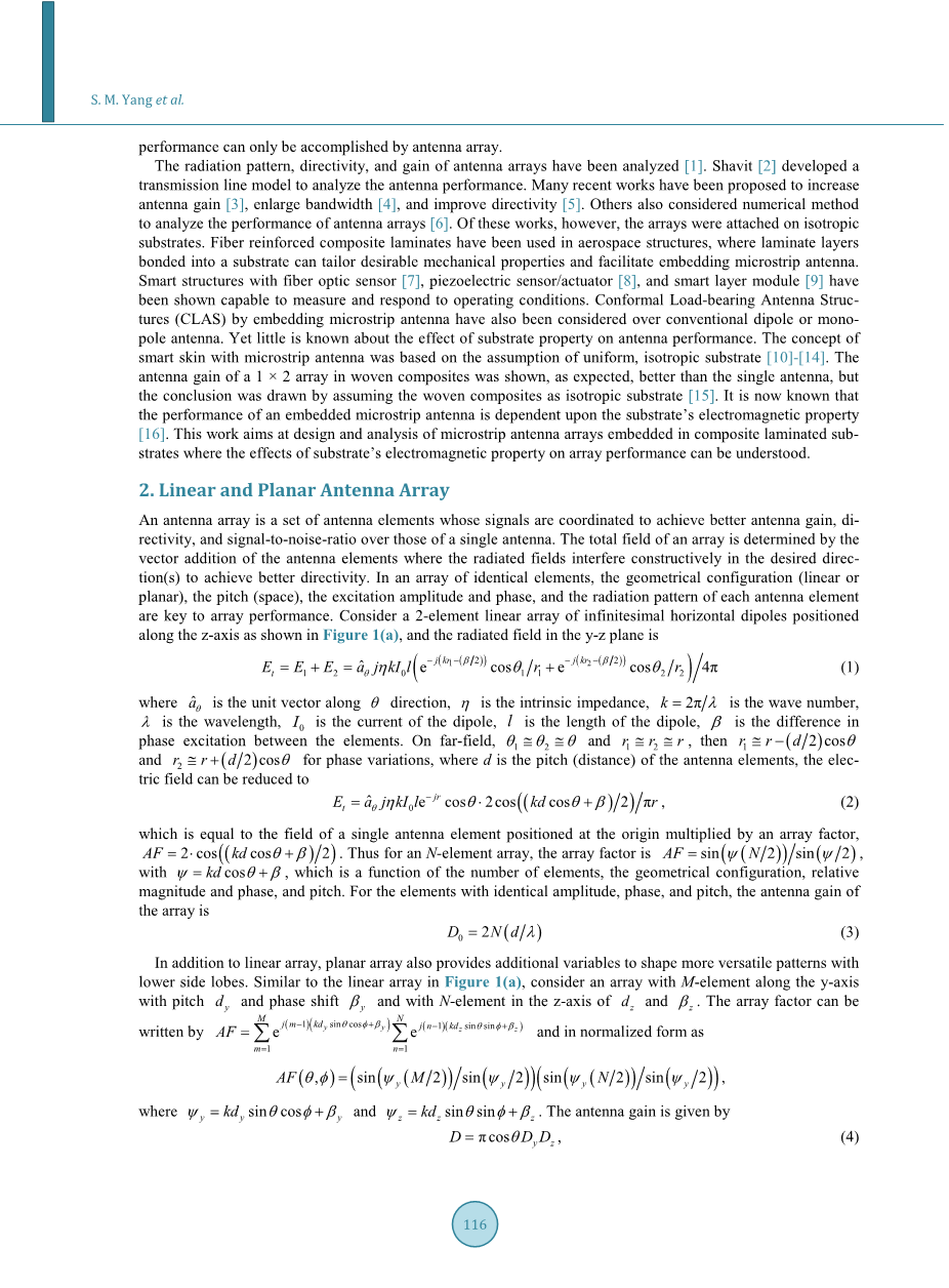 在分析了天线阵列的辐射图,方向性和增益[1]之后,Shavit [2]开发了一种传输线模型来分析天线性能。许多最近的作品被提出增加天线增益[3],放大带宽[4]和提高方向性[5],其他的还考虑了数值方法来分析天线阵列的性能[6]。然而,在这些作品中,阵列附着在各向同性基底上。纤维增强复合层压板已经用于航空航天结构中,其中粘结到基底中的层压层可以定制期望的机械性能并且便于嵌入微带天线。具有光纤传感器[7],压电传感器/致动器[8]和智能层模块[9]的智能结构已经被证明能够测量和响应操作条件。通过嵌入微带天线的共形承载天线结构(CLAS)超过常规偶极或单极天线也已经被考虑了。然而很少知道基板性质对天线性能的影响。 带有微带天线的智能皮肤的概念是基于均匀,各向同性基底的假设[10] - [14]。编织复合材料中1times;2阵列的天线增益和预期一样被证明为优于单个天线,但结论是通过假定编织复合材料为各向同性基底而得出的[15]。现在已知嵌入式微带天线的性能取决于基底的电磁特性[16]。这项工作旨在设计和分析嵌入复合层叠子板中的微带天线阵列,其中基底的电磁特性对阵列性能的影响能被理解。