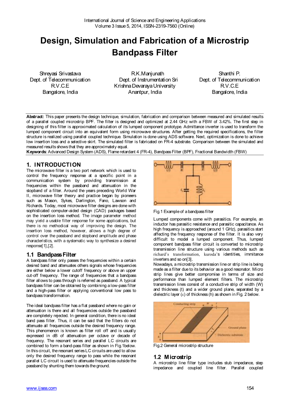 摘要:本文介绍了并联耦合微带带通滤波器的设计、仿真和制造过程以及测量结果和仿真结果的比较。该滤波器的设计和优化带通区间在2.44GHz附近,分数带宽为3.42%。设计该滤波器的的第一步是对其集总元件原型的近似计算。导纳反相器用于使用微波结构将集总元件电路变换成等效形式。在获得所需的规格之后,使用并联耦合技术实现滤波器结构并使用ADS软件进行模拟,接下来进行优化以实现低插入损耗和选择裙。 模拟滤波器在FR-4基板上制造。 模拟和测量结果之间的比较显示它们近似相等。
