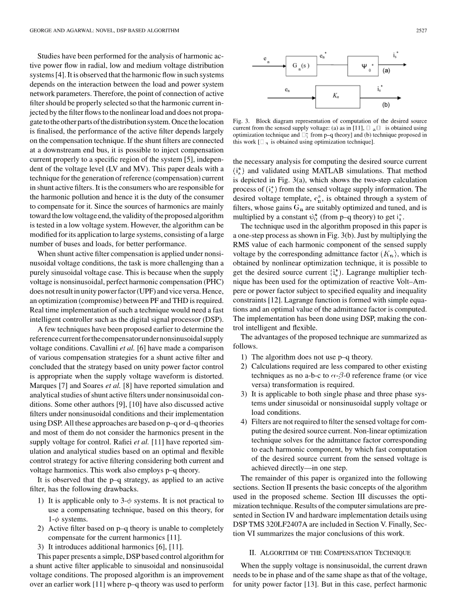 当在非正弦电压条件下应用并联有源滤波器补偿时,该任务比纯正弦电压情况更具挑战性。这是因为当电源电压为非正弦波时,完美谐波补偿(PHC)不会产生单位功率因数(UPF),反之亦然。因此,需要PF和THD之间的优化(折衷)。这种技术的实时实现需要快速智能控制器,例如数字信号处理器(DSP)。早先已经提出了一些技术来确定补偿器现代的参考电流,以确定电压条件。卡瓦利尼等人。[6] 对并联有源滤波器的各种补偿策略进行了比较,得出结论:当电源电压波形失真时,基于单位功率因数控制的策略是合适的。马克斯[7] 和Soares等人。[8] 已经报道了非正弦条件下并联有源滤波器的模拟和分析研究。其他一些作者[9], [10] 还讨论了非正弦条件下的有源滤波器及其使用DSP的实现。所有这些方法都基于p-q或d-q理论,并且大多数方法不考虑电源电压中存在的谐波用于控制。Rafiei等。[11]已经报道了基于最佳和灵活的有源滤波控制策略的仿真和分析研究,同时考虑电流和电流电压谐波。这项工作也采用了p-q理论。