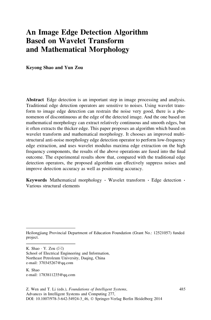 摘要:边缘检测是图像处理和分析中的重要一步。传统边缘检测算子对噪声敏感。使用小波变换形成图像边缘检测可以很好地抑制噪声,在检测到的图像的边缘存在不连续的现象。而一个基于数学形态可以提取相对连续和平滑的边缘,但是它经常提取较厚的边缘。本文提出了一种基于该算法的算法小波变换和数学形态学。它选择了一个改进的多结构抗噪声形态边缘检测算子执行低频边缘提取,并使用小波模最大值边缘提取高频率分量,上述操作的结果融合到最后结果。实验结果表明,与传统边缘相比检测算子,提出的算法可以有效抑制噪声提高检测精度以及定位精度。