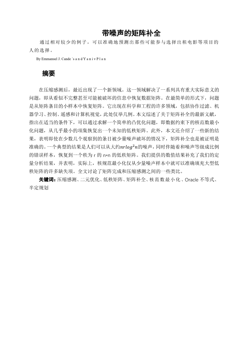 带噪声的矩阵补全外文翻译资料 2023-01-16 09:56:05 英语原文共 12 页,剩余内容已隐藏,支付完成后下载完整资料 英语译文共 7 页,剩余内容已隐藏,支付完成后下载完整资料 资料编号:[239308],资料为PDF文档或Word文档,PDF文档可免费转换为Word 原文和译文剩余内容已隐藏,您需要先支付 30元 才能查看原文和译文全部内容!立即支付 发小红书推广免费获取该资料资格。点击链接进入获取推广文案即可: Ai一键组稿 | 降AI率 | 降重复率 | 论文一键排版 PREVIOUS NEXT 您可能感兴趣的文章 带有Mini-LED背光的高动态范围液晶显示器外文翻译资料 基于局部直方图均衡的分层曝光无伪影高动态范围成像外文翻译资料 深入了解卷积外文翻译资料 基于局部和全局强度信息的主动轮廓模型用于医学图像分割外文翻译资料 采用叠加场效应管结构的毫米波功率放大器的分析与设计外文翻译资料 用于宽带包络跟踪的动态堆叠控制CMOS射频功率放大器外文翻译资料 文本无关说话人识别综述:从特征到超向量外文翻译资料 用SIMULINK启动外文翻译资料 AlGaN/GaN HEMT中电子迁移率与欧姆接触宽度关系的研究外文翻译资料 基于物联网的实时二氧化碳监测云技术外文翻译资料