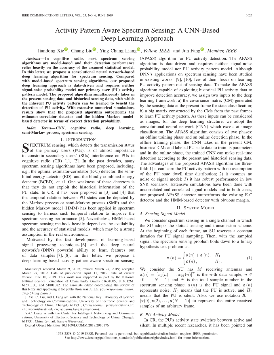 活动模式感知频谱感知:一种基于cnn的深度学习方法外文翻译资料 2023-02-06 09:15:43 英语原文共 4 页,剩余内容已隐藏,支付完成后下载完整资料 英语译文共 14 页,剩余内容已隐藏,支付完成后下载完整资料 资料编号:[245630],资料为PDF文档或Word文档,PDF文档可免费转换为Word 原文和译文剩余内容已隐藏,您需要先支付 30元 才能查看原文和译文全部内容!立即支付 发小红书推广免费获取该资料资格。点击链接进入获取推广文案即可: Ai一键组稿 | 降AI率 | 降重复率 | 论文一键排版 PREVIOUS NEXT 您可能感兴趣的文章 带有Mini-LED背光的高动态范围液晶显示器外文翻译资料 基于局部直方图均衡的分层曝光无伪影高动态范围成像外文翻译资料 深入了解卷积外文翻译资料 基于局部和全局强度信息的主动轮廓模型用于医学图像分割外文翻译资料 采用叠加场效应管结构的毫米波功率放大器的分析与设计外文翻译资料 用于宽带包络跟踪的动态堆叠控制CMOS射频功率放大器外文翻译资料 文本无关说话人识别综述:从特征到超向量外文翻译资料 用SIMULINK启动外文翻译资料 AlGaN/GaN HEMT中电子迁移率与欧姆接触宽度关系的研究外文翻译资料 基于物联网的实时二氧化碳监测云技术外文翻译资料