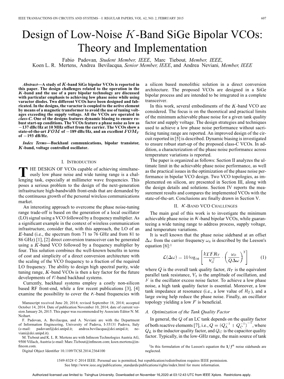 在这项工作中,考虑了A波段VCO的几个实施例。重点是在给定品质因数和电源电压下,最小可实现相位噪声的理论和实践极限。报告了在不牺牲调谐范围的情况下实现低相位噪声性能的设计策略和技术。文[5]介绍了一种改进的电路设计。对动态偏置进行了研究,以确保拟议的C类VCO的稳健启动。此外,还报告了温度变化时相位噪声性能的表征。论文组织如下:第二节分析了双极压控振荡器设计中可实现相位噪声性能的极限,以及相位噪声性能优化的实际问题。第三节介绍了两种在硅上实现的VCO拓扑,以及设计细节和解决方案。第四节报告了测量结果,并将实施的VCO与最先进的VCO进行了比较。第五节最后得出结论。