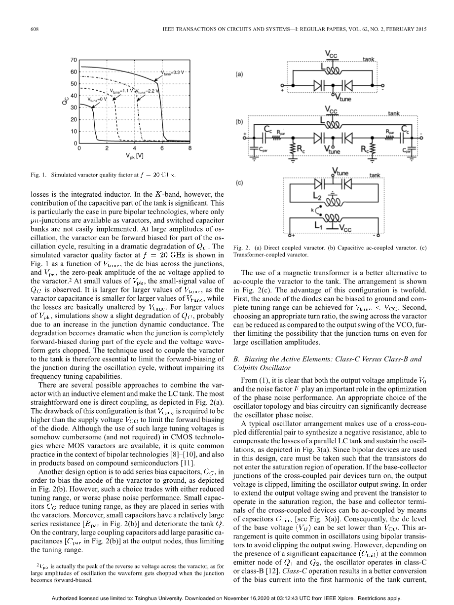然而,在V波段,油箱电容部分的贡献是显著的。这在纯双极技术中尤其如此,在纯双极技术中,只有pn结可用作变容二极管,并且开关电容器组不容易实现。在大振幅的振荡下,变容二极管可以在部分振荡周期中正向偏置,从而导致Qc的急剧退化。图1中显示了f=20 GHz时的模拟变容二极管品质因数,该品质因数是Vtuue结间直流偏置和Vpk(施加到变容二极管的交流电压的零峰值振幅)的函数。在Vpk的小值处,观察到Qc的小信号值。当Vtuue的值较大时,它较大,因为变容二极管电容对于Vtuue的值较大时较小,而损耗基本上不受Vtuue的影响。对于较大的Vpk值,模拟显示QC略有下降,可能是由于结动态电导的增加。当结在部分周期内完全正向偏置且电压波形被斩波时,劣化变得显著。因此,用于将变容二极管耦合到油箱的技术对于限制振荡周期中结的正向偏置而不损害其频率调谐能力至关重要。