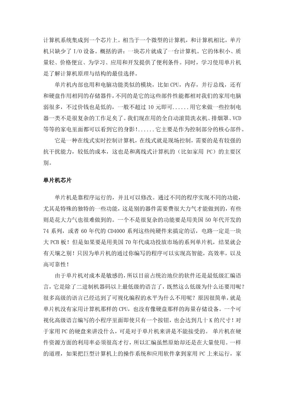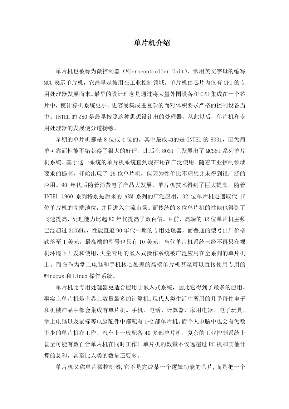Single chip, also known as single-chip microcontroller, it is not complete a certain logic chips, but to a computer system integrated into a chip. Equivalent to a micro-computer, and computer than just the lack of a microcontroller I / O devices. General talk: a chip becomes a computer. Its small size, light weight, cheap, for the study, application and development of facilities provided. At the same time, learning to use the MCU is to understand the principle and structure of the computer the best choice. SCM and the computer functions internally with similar modules, such as CPU, memory, parallel bus, the same effect as well, and hard disk memory devices, and different is its performance of these components were relatively weak many of our home computer, but the price is low , usually not more than 10 yuan you can do with it ...... some control for a class is not very complicated electrical work is enough of. We are using automatic drum washing machine, smoke hood, VCD and so on appliances which could see its shadow! ...... It is primarily as a control section of the core components