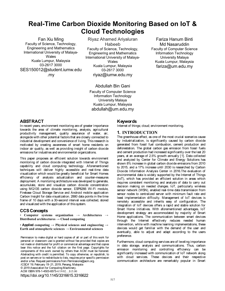 此外,云计算服务在数据存储、分析和通信方面同样重要。因此,通过物联网网络的通信和云服务,可以显著提高碳排放监测和控制效率。这些设备和它们各自的通信架构在Smart中非常流行世界各地的家庭倡议[2]。物联网,特别是无线传感器网络(WSN),实现了传感器节点到集中式服务器的实时数据传输,故障率和实现难度最小。本研究集中于使用结构良好的物联网和基于云的架构来监测环境变化的收集和分析方法。