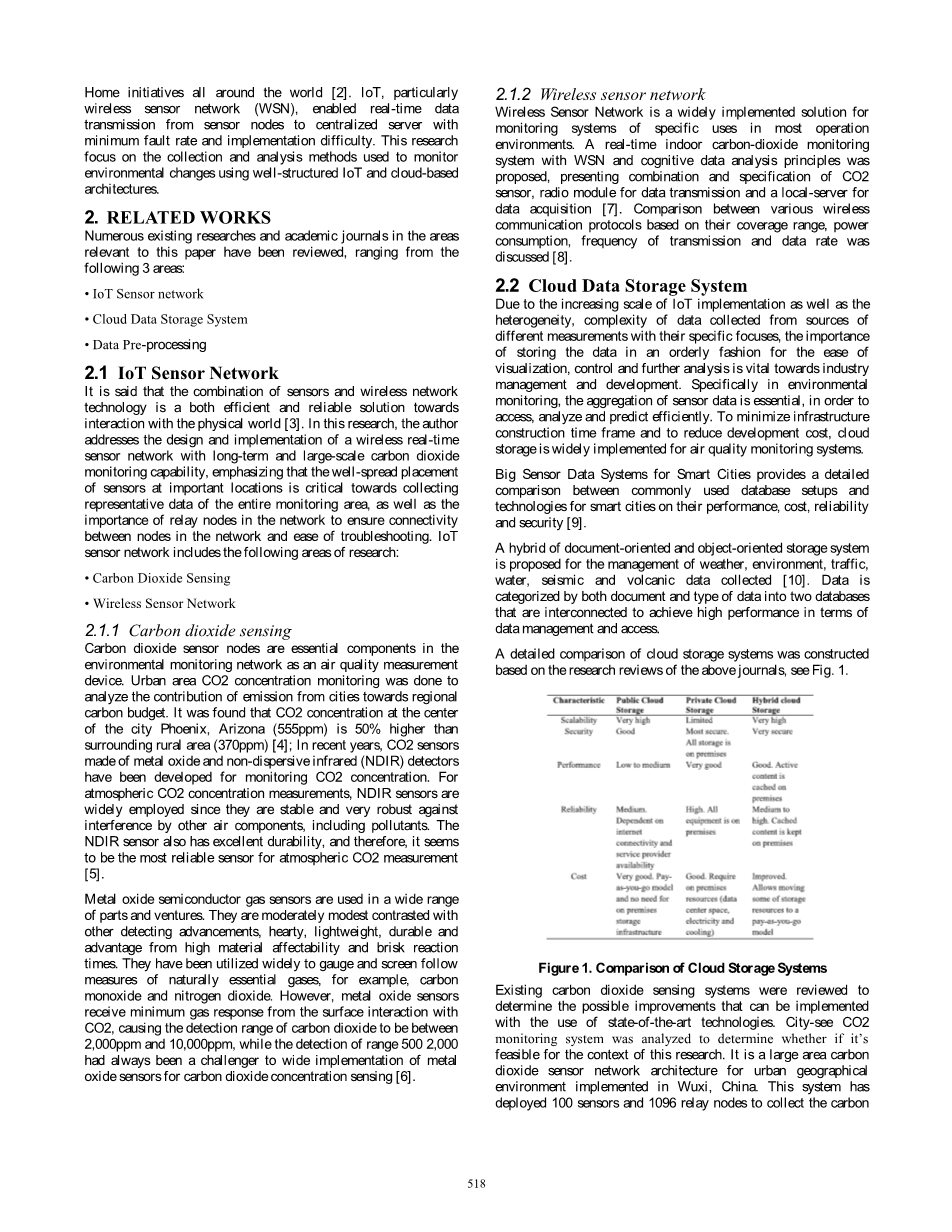 对现有的二氧化碳传感系统进行了审查以确定利用最先进的技术可以实施哪些可能的改进。对City-see CO2监测系统进行分析,以确定其在本研究背景下是否可行。它是在中国无锡实施的一种面向城市地理环境的大面积二氧化碳传感器网络架构。该系统部署了100个传感器和1096个中继节点来收集碳有关环境中的二氧化碳浓度。在数据采集、存储、处理和传感器网络管理等方面提出了挑战和解决方案。它是一个大规模的无线传感器网络,具有先进的网络管理策略和数据可视化技术,但它并没有实现任何与云相关的数据存储解决方案,而是采用了一个本地数据基站来存储数据。综上所述,文献综述表明,物联网无线传感器网络与TCP/IP通信协议是最适合该项目场景所需的传感器监控网络,因为无线传感器网络明显更持久,且易于部署和维护。我们还发现云数据库是最适合这种场景的,因为它具有高可伸缩性、高成本效率、最小的人工干预和维护成本等优点。在这方面,City-See二氧化碳监测系统缺乏基于云的网络的可访问性优势。