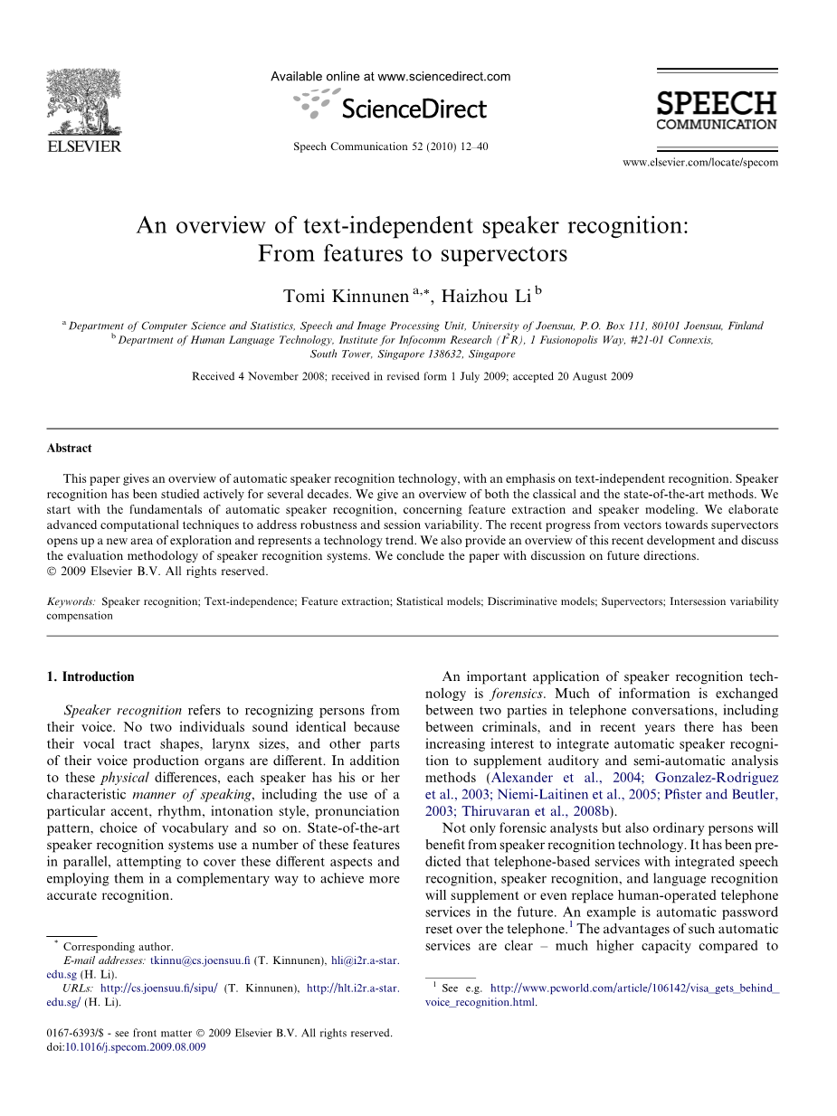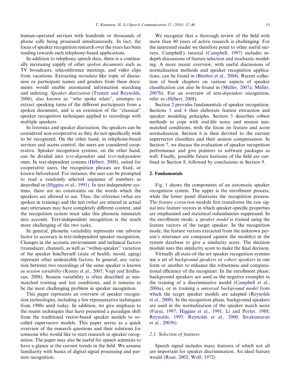 本文概述了说话人识别技术,包括从 1980 年代至今的 一些代表性技术。此外,我们重点介绍了最近的技术,这 些技术已呈现出从基于矢量的传统说话人模型到所谓的超 矢量模型的范式转变。本文将为想要开始说话人识别研究 的人提供研究问题及其解决方案的快速概述。这篇论文对 于语音科学家来说也可能是有用的,以了解该领域的当前 趋势。我们假设熟悉数字信号处理和模式识别的基础。 我们认识到,经过 40 多年的积极研究,对该领域进行 全面的审查具有挑战性。因此,对于感兴趣的读者,我们 指向其他有用的调查。坎贝尔的教程(坎贝尔,1997 年)包括对特征选择和随机建模的深入讨论。可以在()中找到更新的概述,其中对归一化方法和说话人识别应用进行了有益的讨论。Bimbot 等,2004).有关说话人分类各个方面的书籍章节的最新集合,也可以在(Muller,2007a;Muller, 2007b).有关基于文本的识别的概述,请参阅(赫伯特,2008 年). 部分 2 提供说话人识别的基础。栏目 3 和 4 然后阐述 特征提取和说话人建模原理。部分 5 描述了针对现实噪声 和会话不匹配条件的可靠方法,重点是功能和评分标准化。部分 6 然后专门讨论当前的超向量分类器及其会话补偿。在节中 7,我们讨论了说话人识别性能的评估,并提供了 指向软件包的指导。最后,本节概述了该领域的未来前景 8,然后是本节中的结论